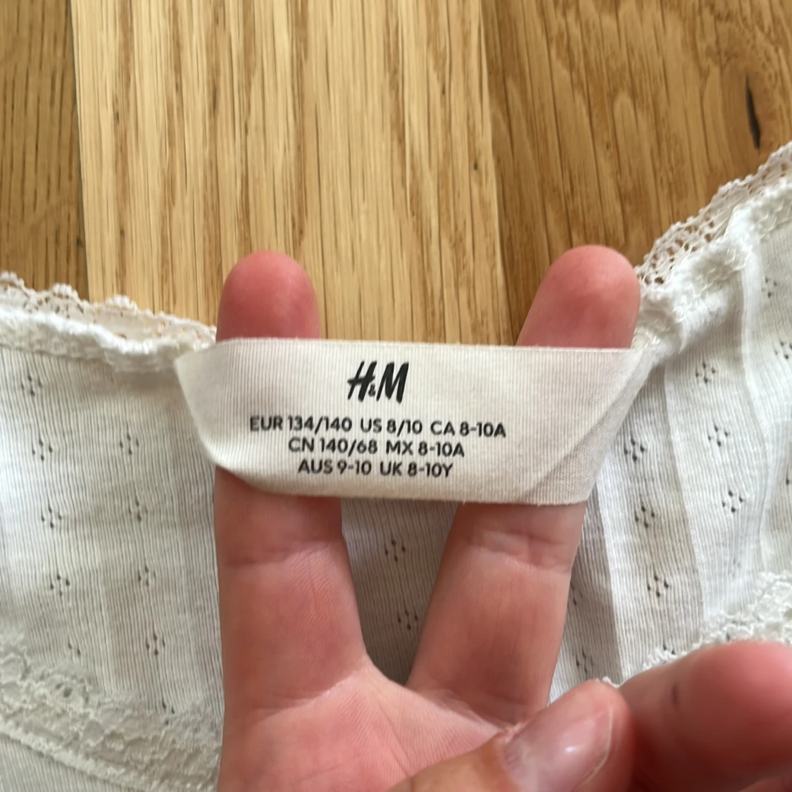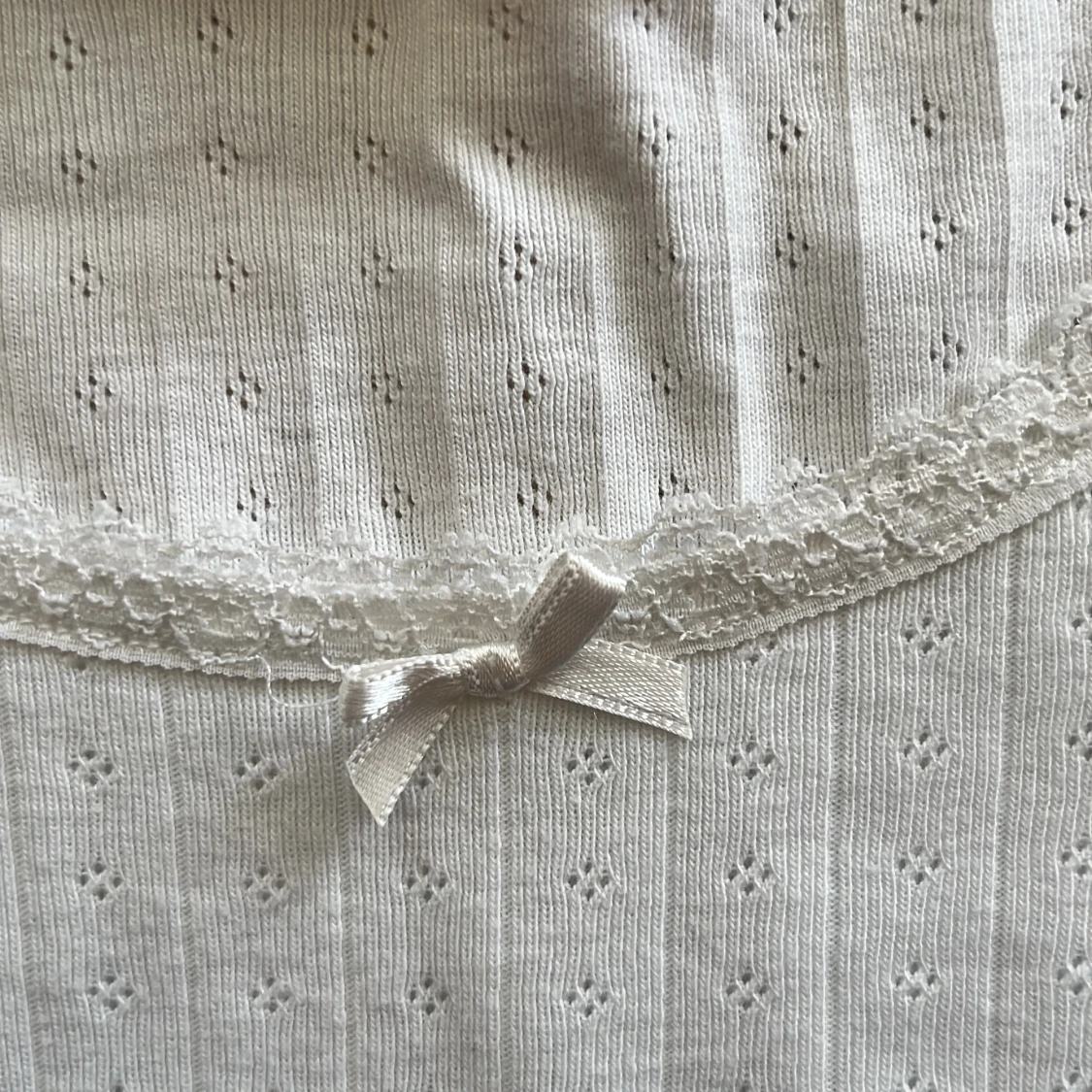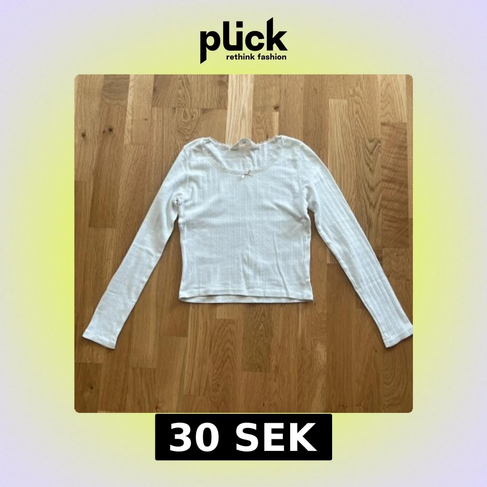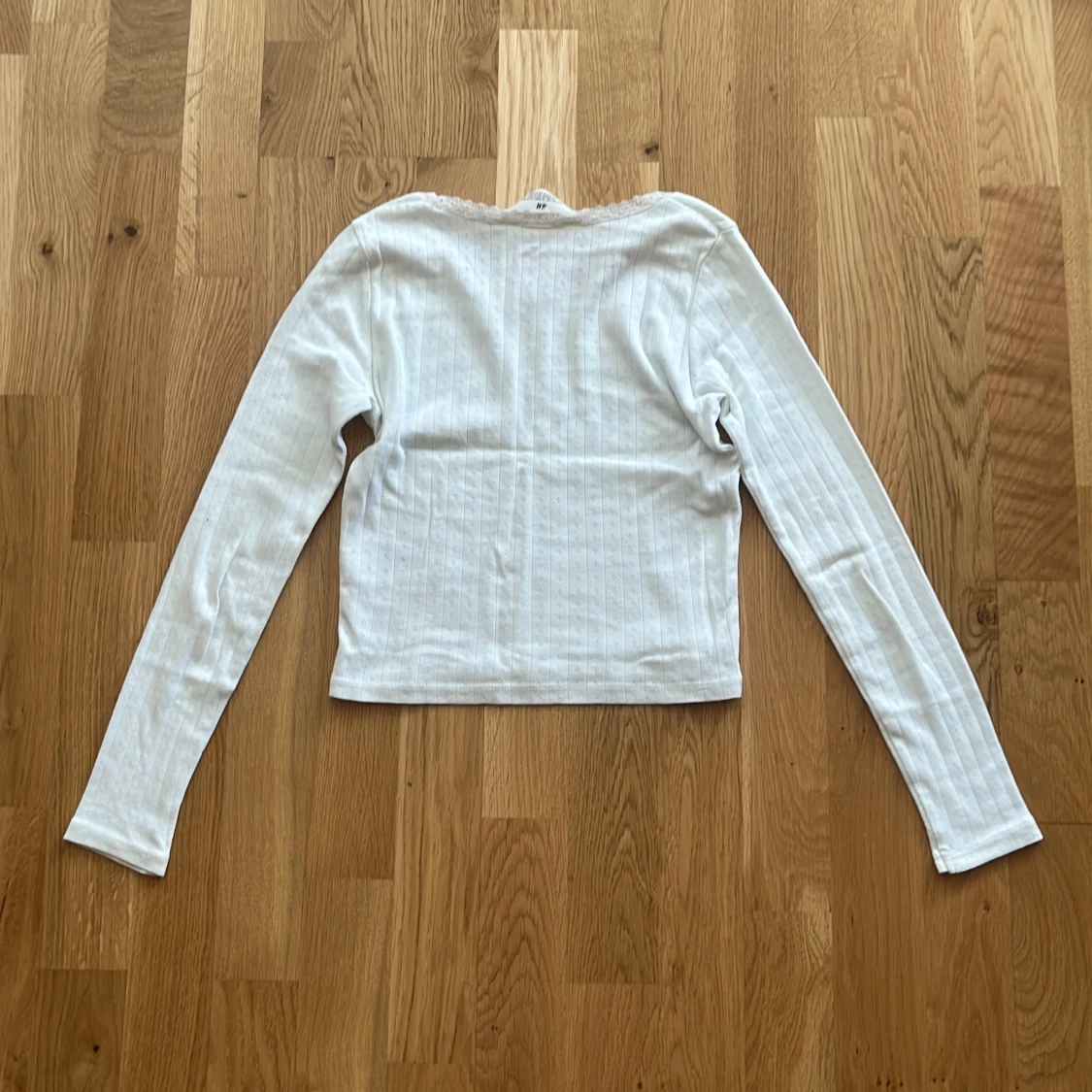 Supersöt vit långärmad topp från H&M med diskret hålmönster, spetskant vid halsen och en liten rosett framtill. , perfekt för lager-på-lager eller som den är. Sitter snyggt med normal passform.