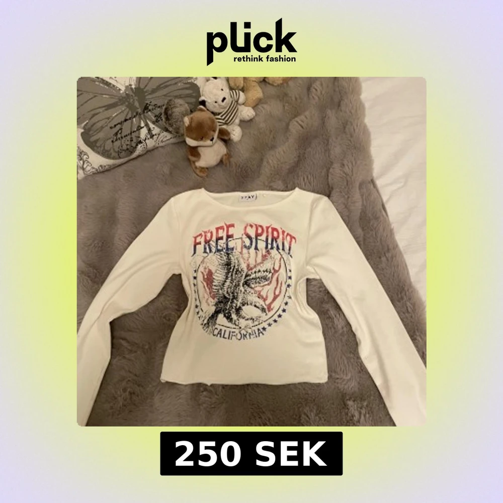 Säljer en vit långärmad topp från STAY med coolt tryck framtill där det står 'Free Spirit' och en örn. Toppen är perfekt för dig som gillar statement-plagg. Knappt använd!