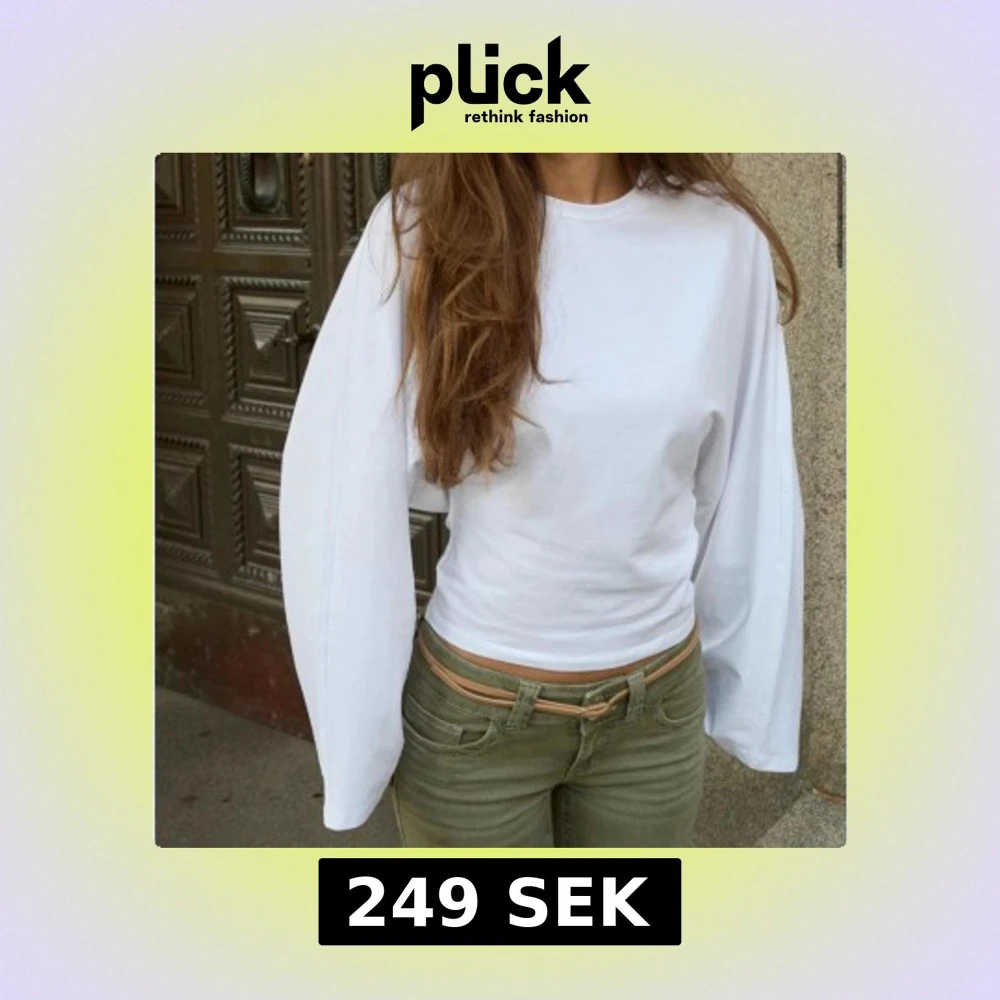 Säljer en vit långärmad topp med riktigt breda och vida ärmar. Modellen är slim och sitter snyggt runt midjan, vilket ger en clean och modern look. Materialet känns som mjuk bomull och toppen är helt utan mönster eller detaljer. Perfekt för dig som gillar minimalistisk stil.