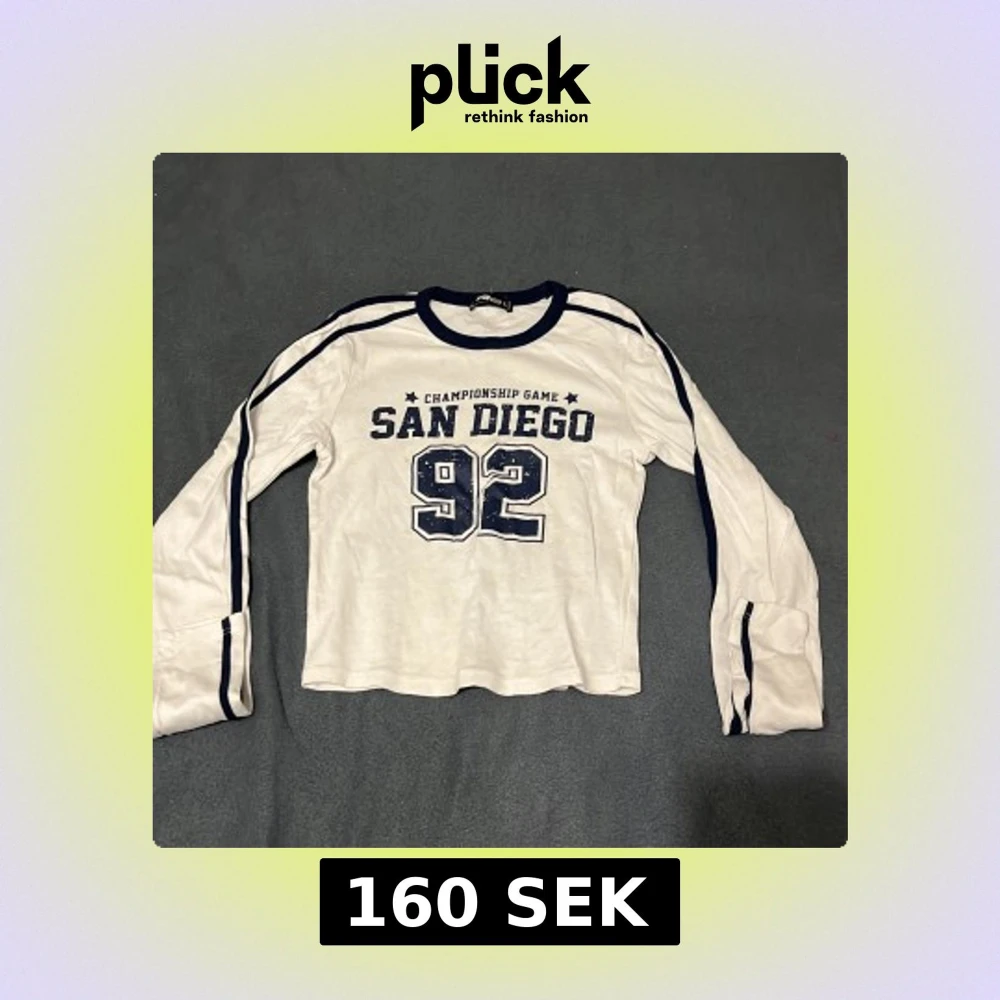 Vit långärmad tröja från FB Sister med marinblå detaljer och tryck 'San Diego 92' på bröstet. Tröjan har kontrastfärgade ränder längs ärmarna och rund halsringning i marinblått. Perfekt för dig som gillar sportig och avslappnad stil.