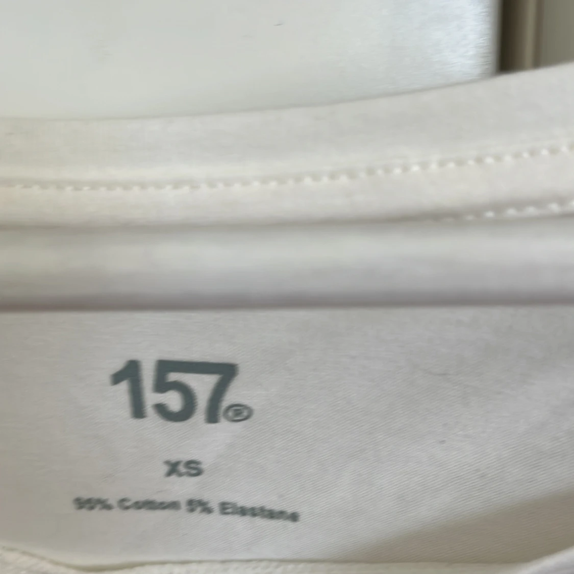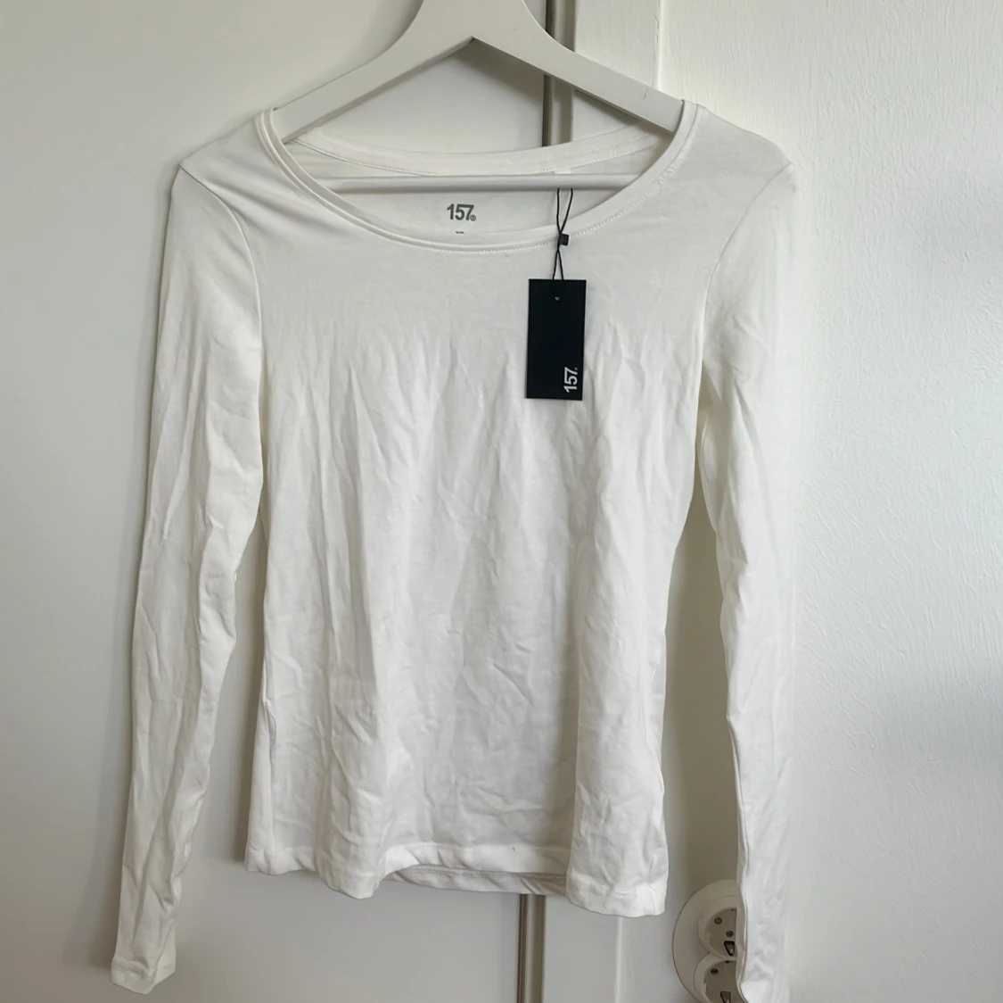 Snygg vit långärmad tröja från 157 i storlek XS. Tillverkad i mjuk bomull med lite stretch för skön passform. Enkel och clean design med rund halsringning, perfekt att styla med jeans eller kjol.