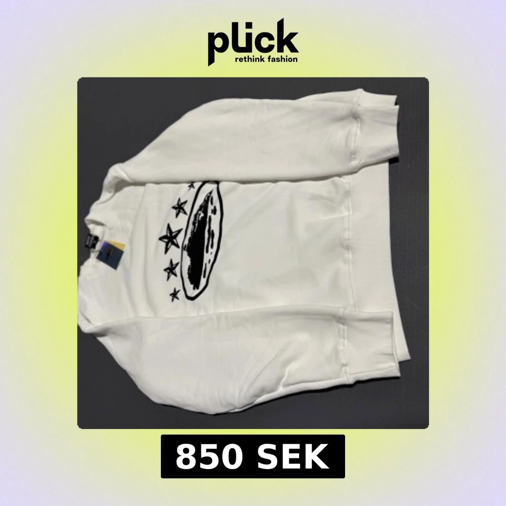 Snygg vit långärmad tröja från Anyware med svart tryck framtill som visar stjärnor och ett ovalt motiv. Tröjan har ribbade muddar vid ärmslut och nederkant, samt rund hals. Materialet är mjukt och känns som bomull, perfekt för chill dagar.