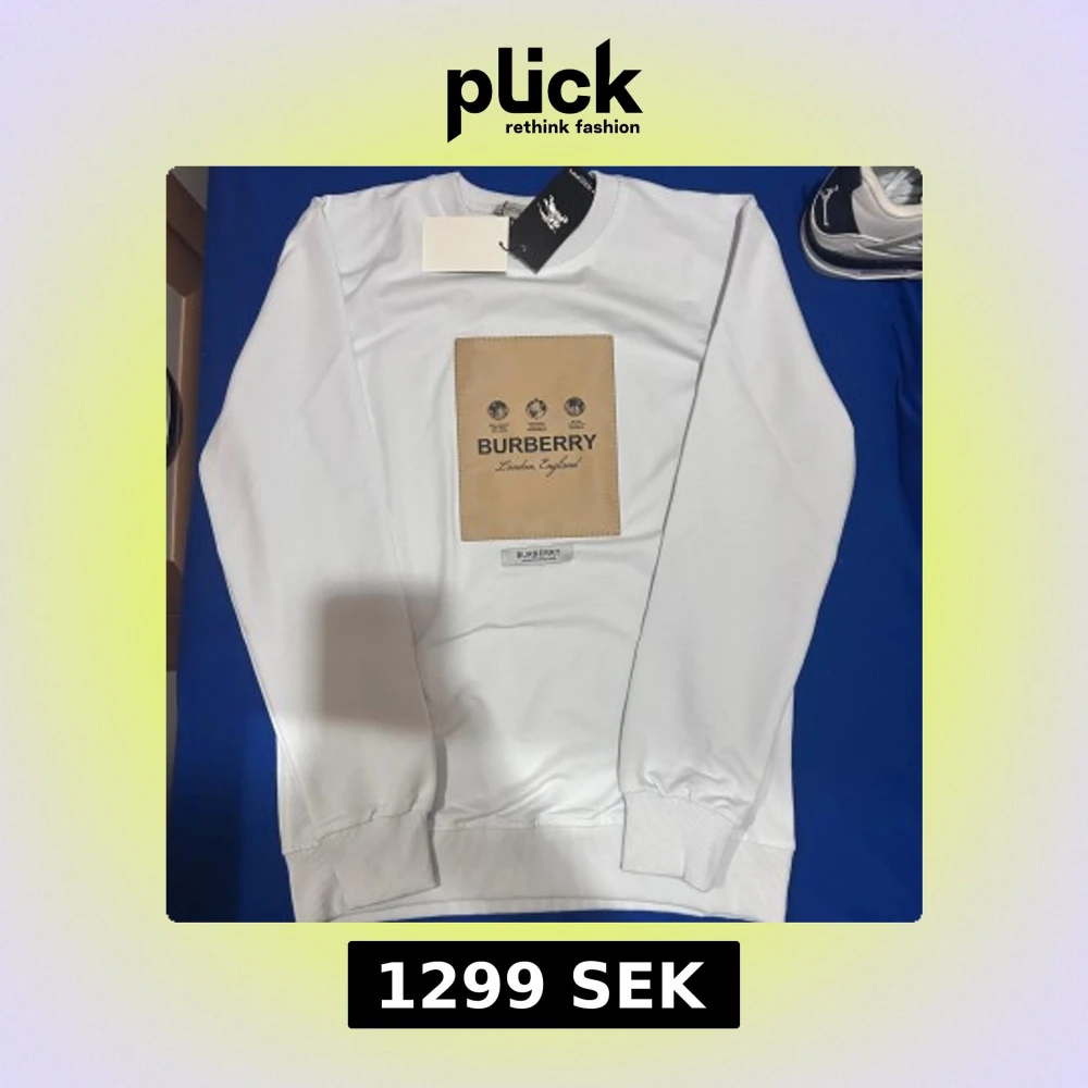 Säljer en stilren vit långärmad tröja från Burberry med ett stort beige tryck på bröstet. Tröjan har ribbade muddar vid ärmslut och nederkant. Perfekt för en avslappnad och trendig look.