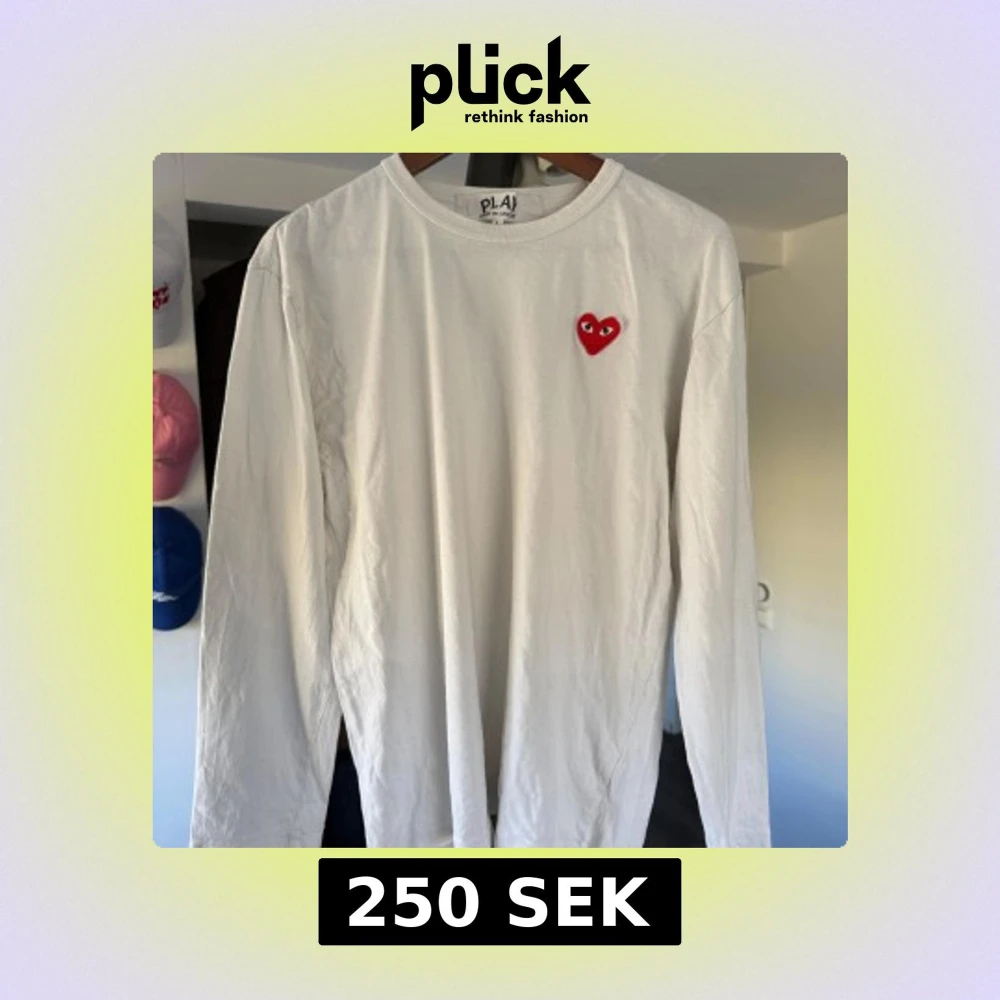 Säljer en stilren vit långärmad tröja från Comme des Garçons med det ikoniska röda hjärtat på bröstet. Perfekt för en minimalistisk look. Tröjan är väldigt liten i storleken och skulle säga att den passar s/m bättre.