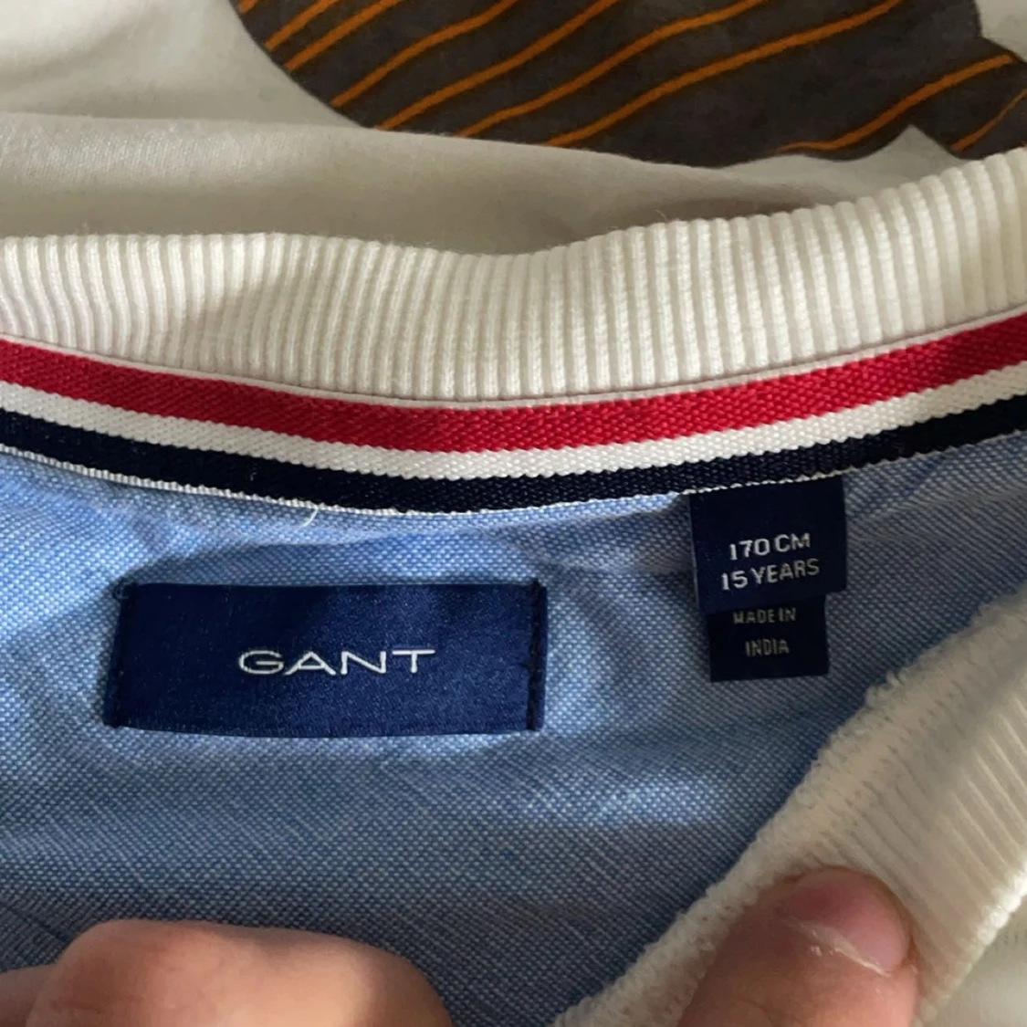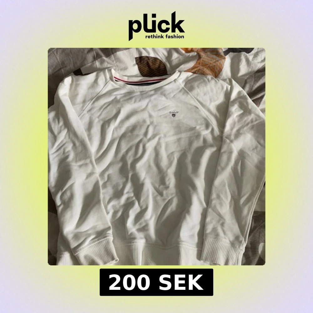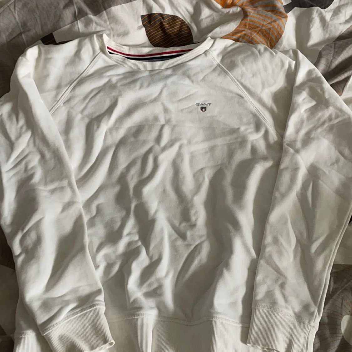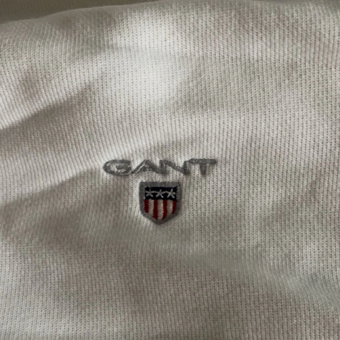 Säljer en stilren vit långärmad tröja från GANT med broderad logotyp på bröstet. Tröjan har ribbade muddar och en klassisk rund halsringning med röd och blå detalj. Perfekt för en avslappnad och snygg look.