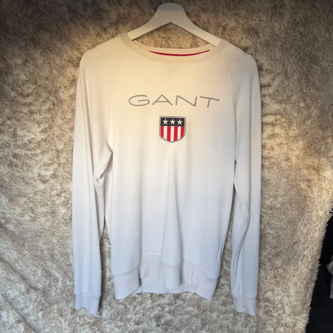 Vit långärmad tröja från GANT med broderad logga och sköld på bröstet.