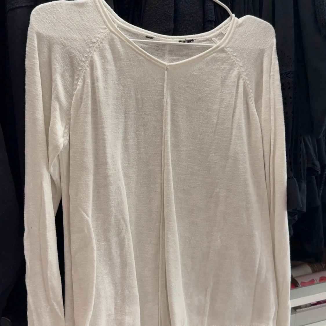 En enkel och stilren vit långärmad tröja från H&M. Tröjan har en rund halsringning och är tillverkad i ett tunt, mjukt material som passar perfekt för lager-på-lager. Perfekt basplagg i garderoben.