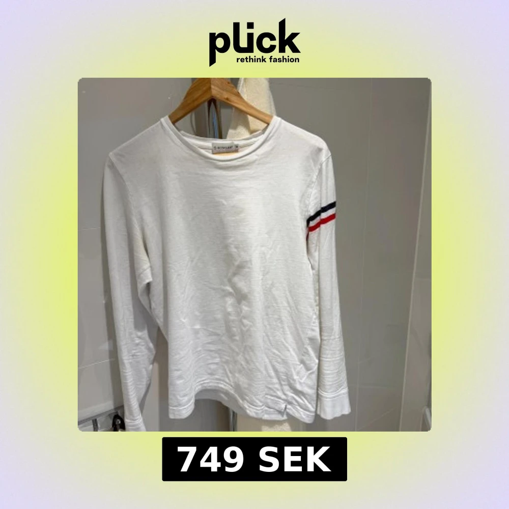 Säljer en stilren vit långärmad tröja från Moncler. Tröjan har en röd och blå randdetalj på ärmen samt Moncler-loggan. Perfekt för en avslappnad och trendig look. Nypris ligger runt 4000 , priset går att diskuteras vid snabb affär . Vid frågor är det bara att fråga