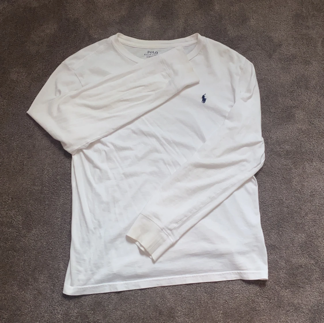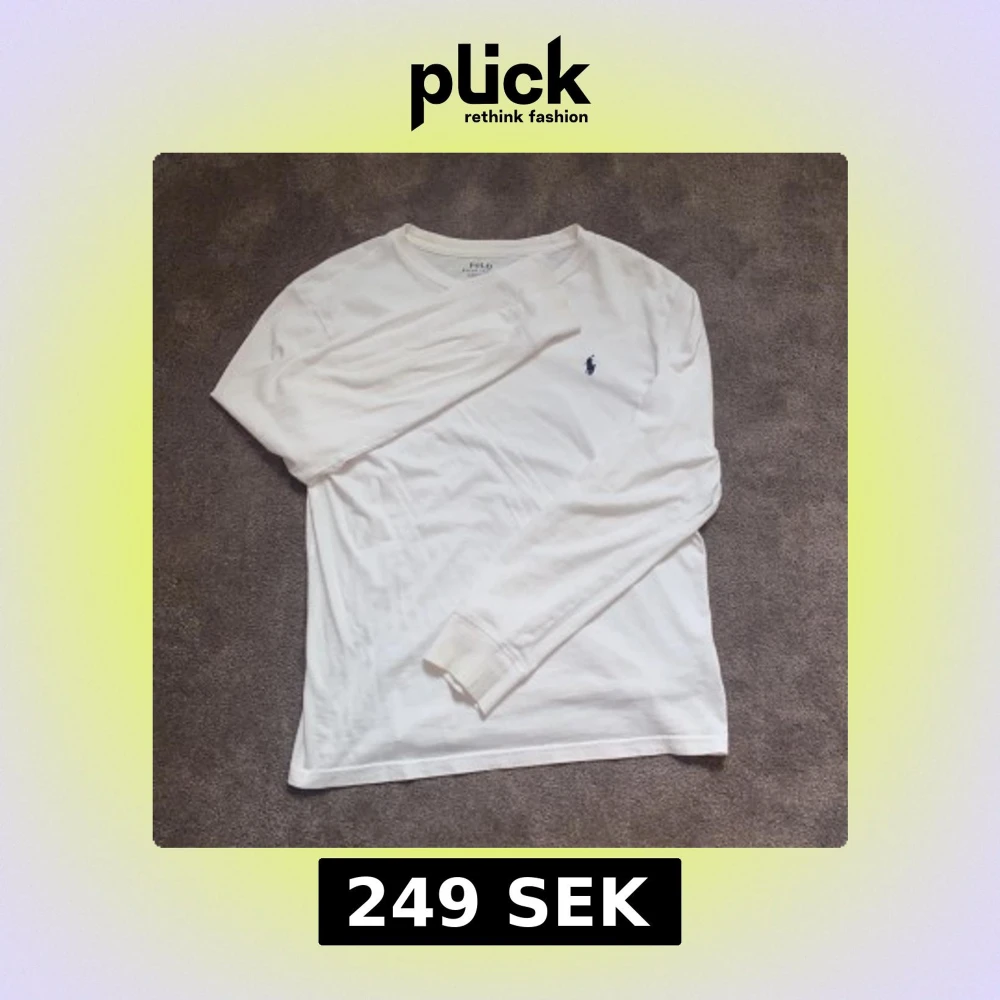 Vit långärmad tröja från Polo Ralph Lauren med klassisk rund hals och den ikoniska broderade loggan på bröstet. Tröjan är gjord i mjuk bomull och har en clean och stilren look. Nypris ca. 1000kr, mitt pris 299. Priset är prutbart. Hör av dig vid minsta funderingar så svarar jag direkt!
