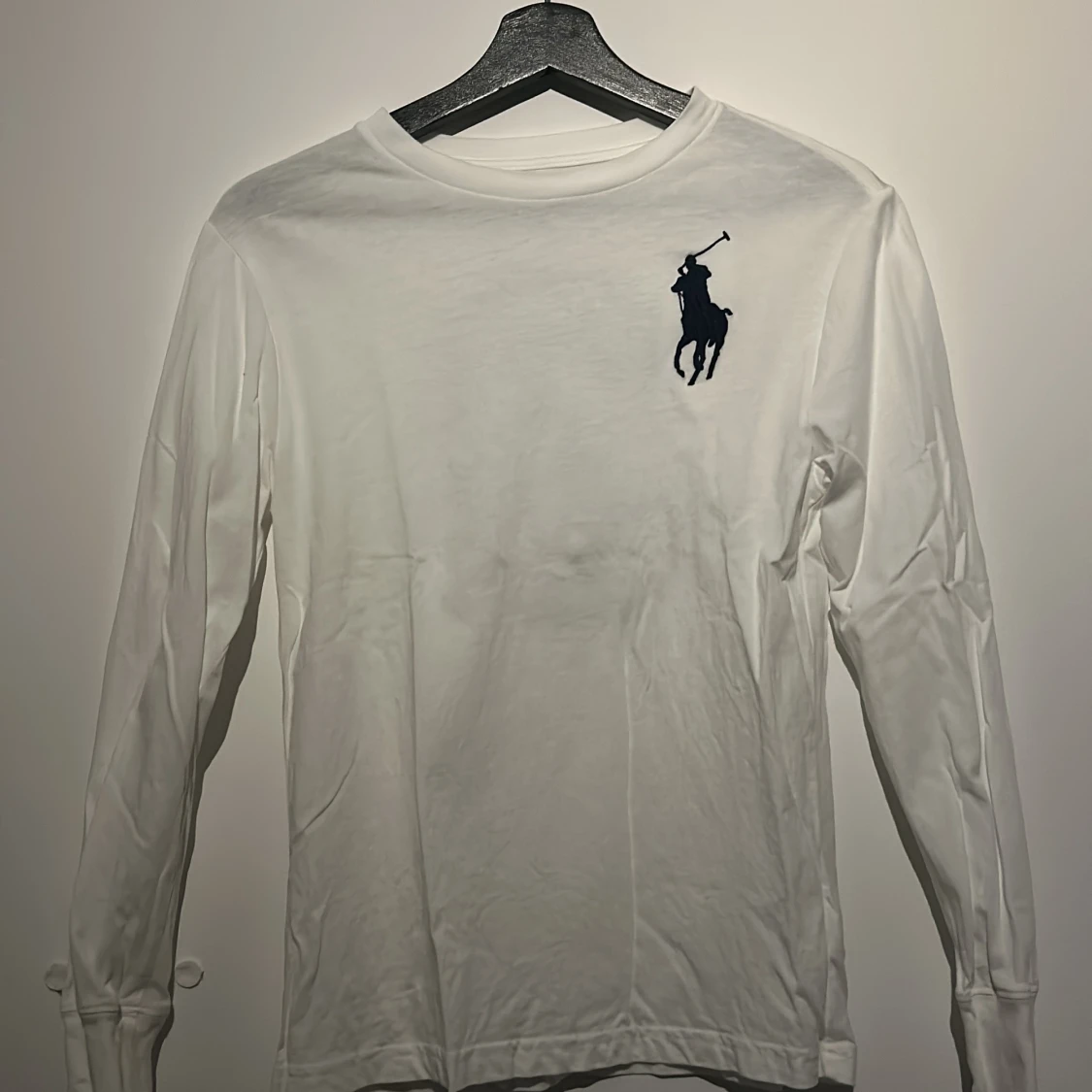 Säljer en stilren vit långärmad tröja från Ralph Lauren med det klassiska polospelarlogotypen på bröstet och en stor siffra 3 på ryggen. Perfekt för en avslappnad och sportig look. Passar bra till jeans eller chinos. Passar alla runt 150 till 158. Tröjan är oanvänd