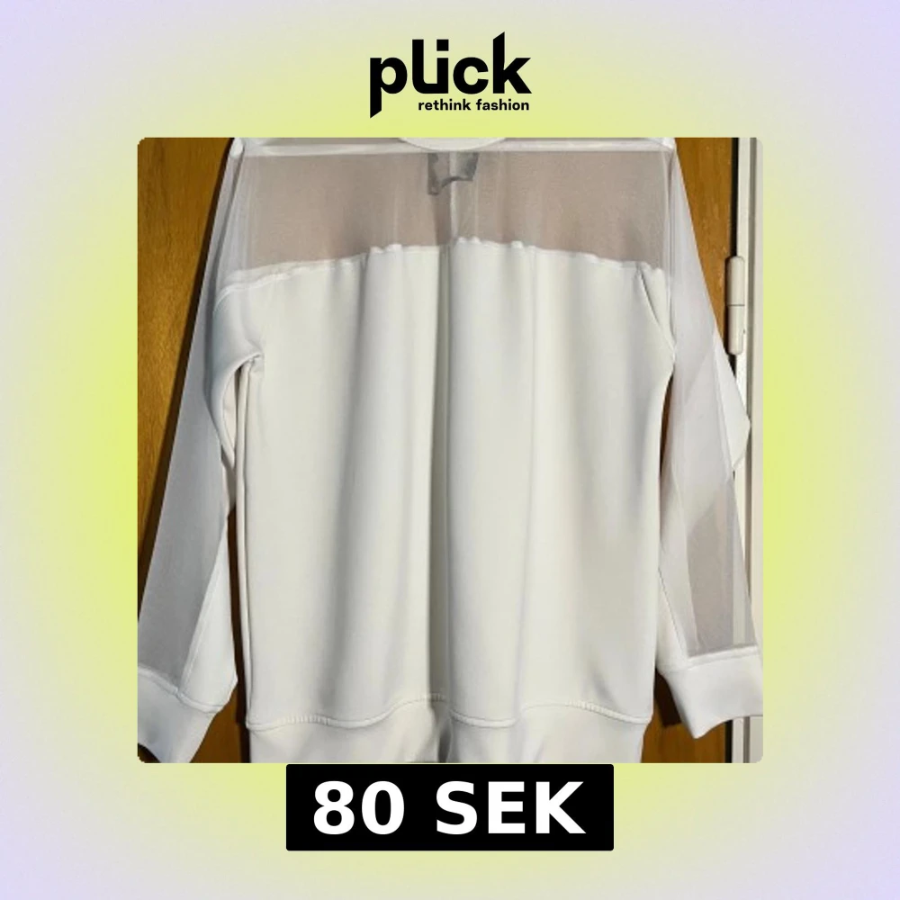 Säljer en vit långärmad tröja i storlek small med transparenta meshpartier över axlar och ärmar. Tröjan har en clean och modern look med rund halsringning och mjukt material. Avklippt etikett men inget som skadat plagget.