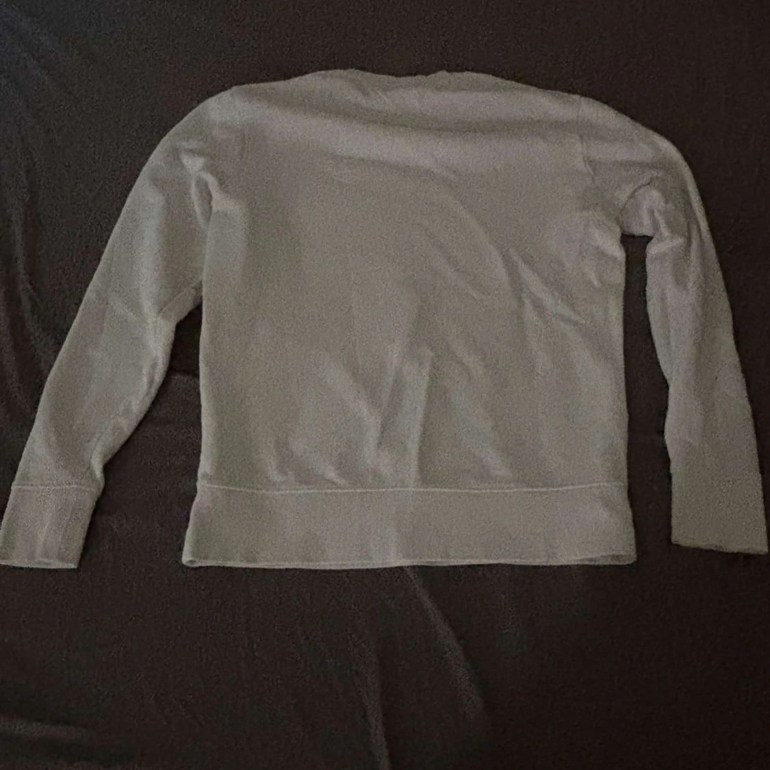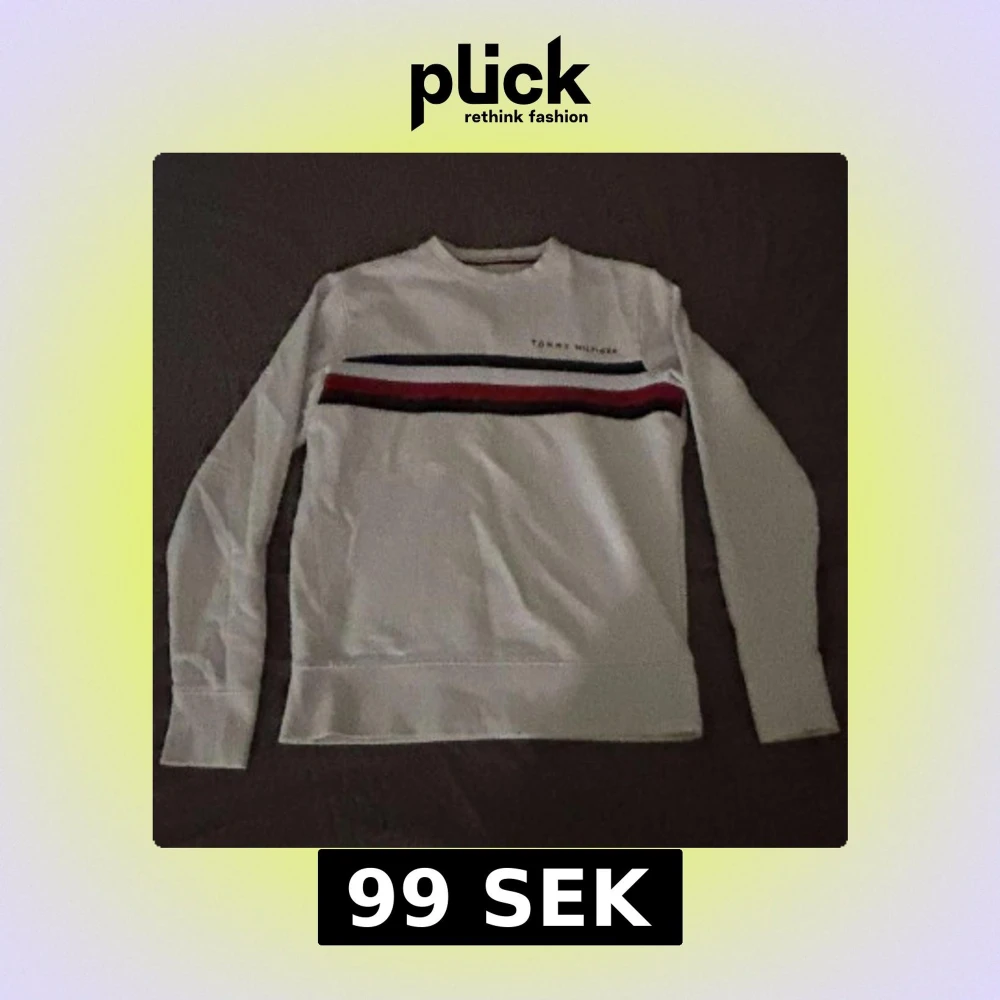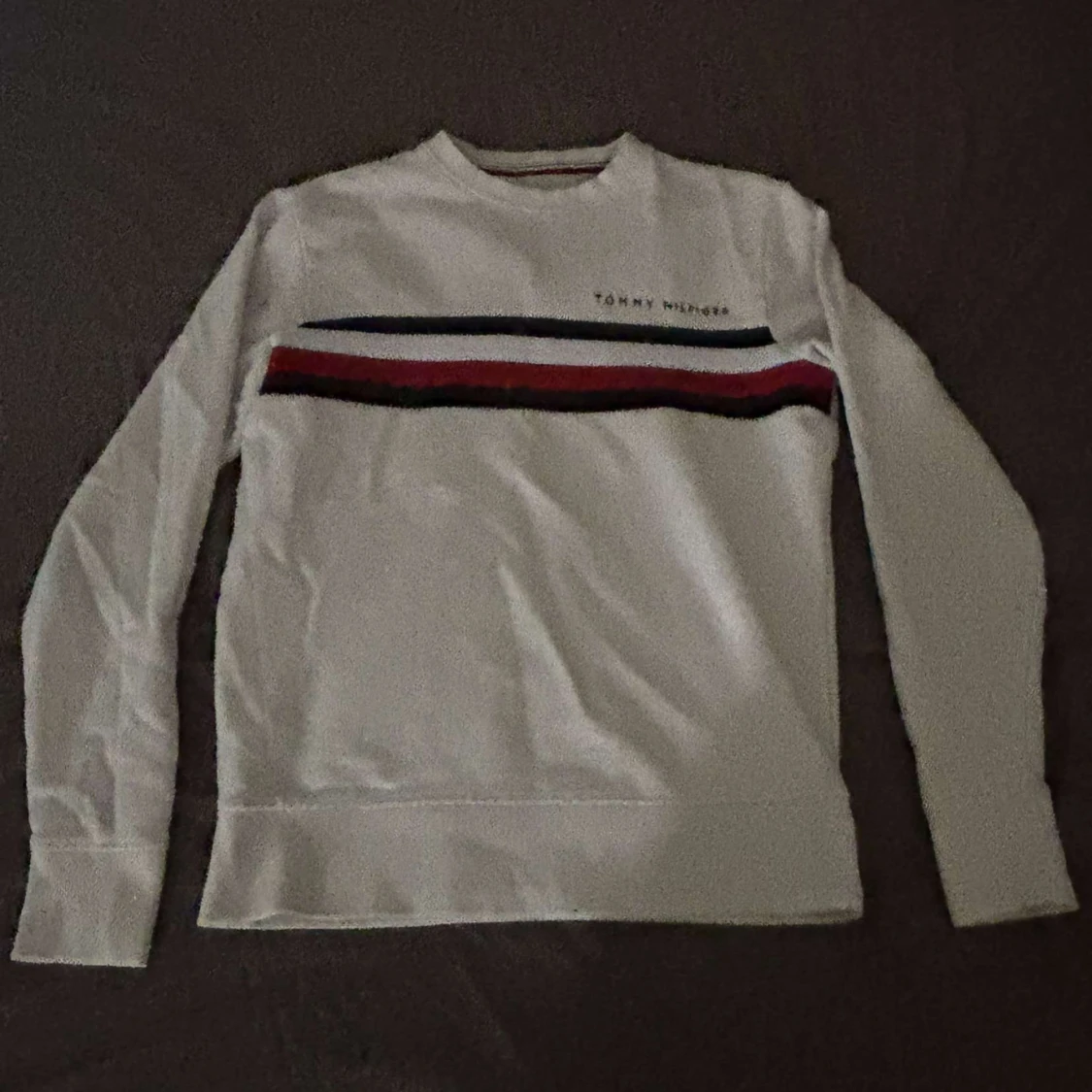 Snygg vit långärmad tröja från Tommy Hilfiger med klassiska ränder i blått, rött och svart över bröstet. Tröjan har rund hals och är tillverkad i mjuk bomull, perfekt för chill dagar. Diskret logga på framsidan ger en clean look.