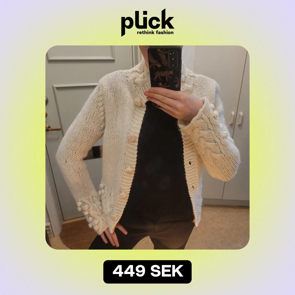Säljer en superfin vit stickad kofta med flätmönster och dekorativa bollar längs ärmarna💕 Den har långa ärmar och knäpps med knappar framtill. Perfekt för kyliga höst- och vinterdagar. I ull så riktig varm!💕