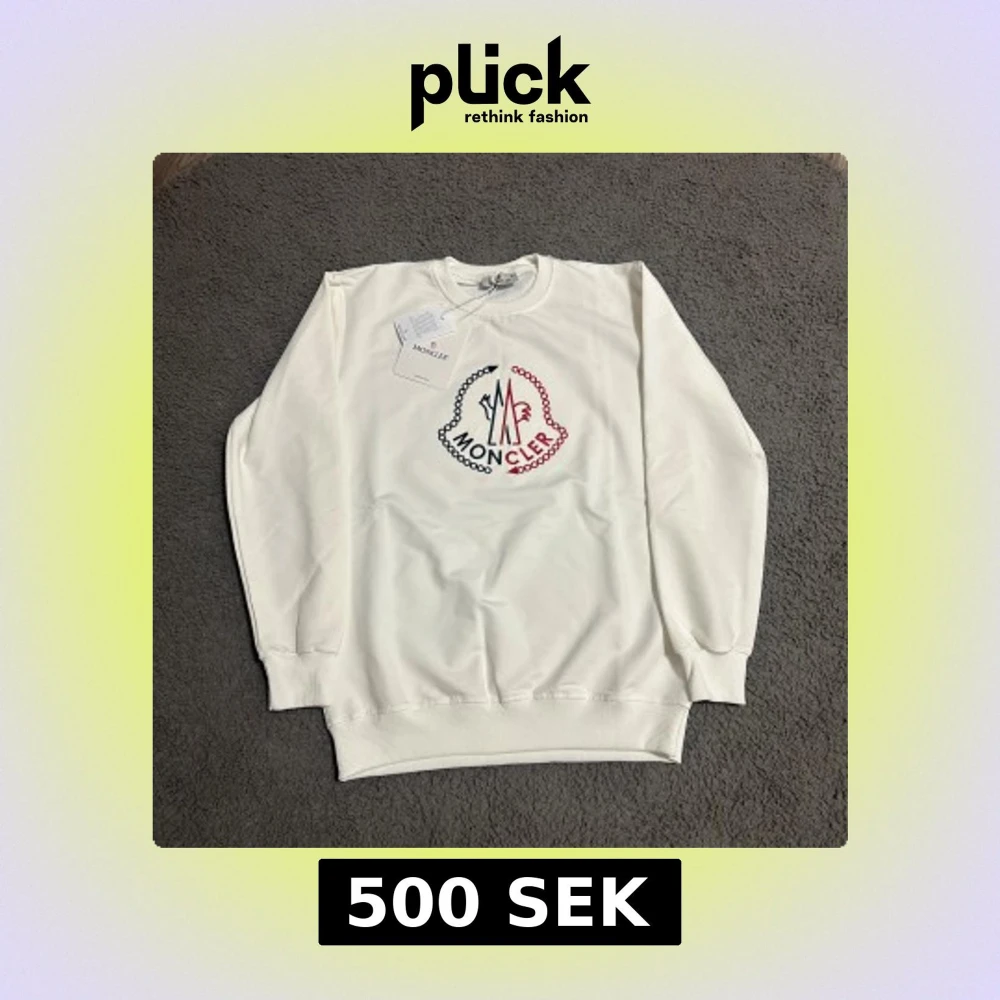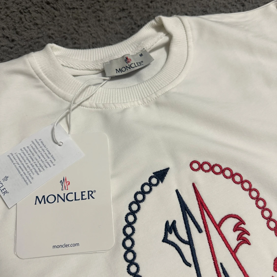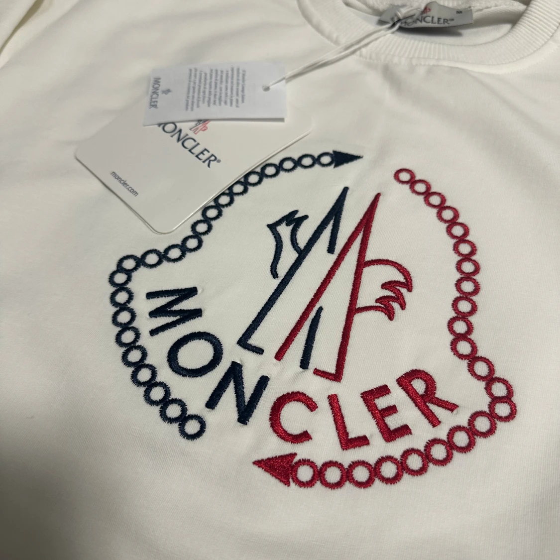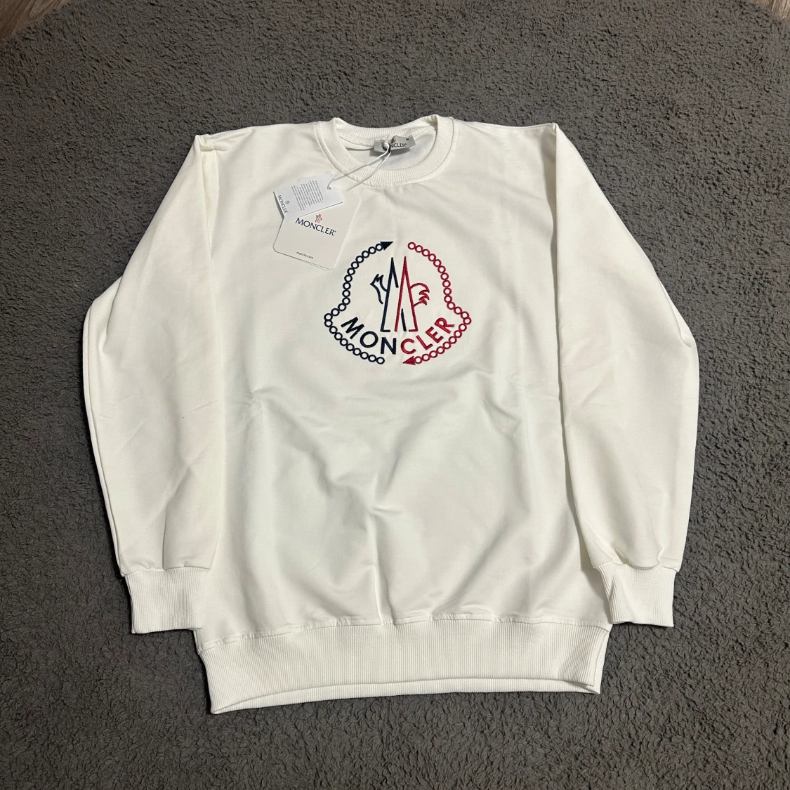 Snygg vit sweatshirt från Moncler med stort broderat logomärke i rött och marinblått på bröstet. Tröjan har rund halsringning, ribbade muddar och är tillverkad i mjuk bomull. Perfekt för dig som gillar stilrena och exklusiva plagg.
