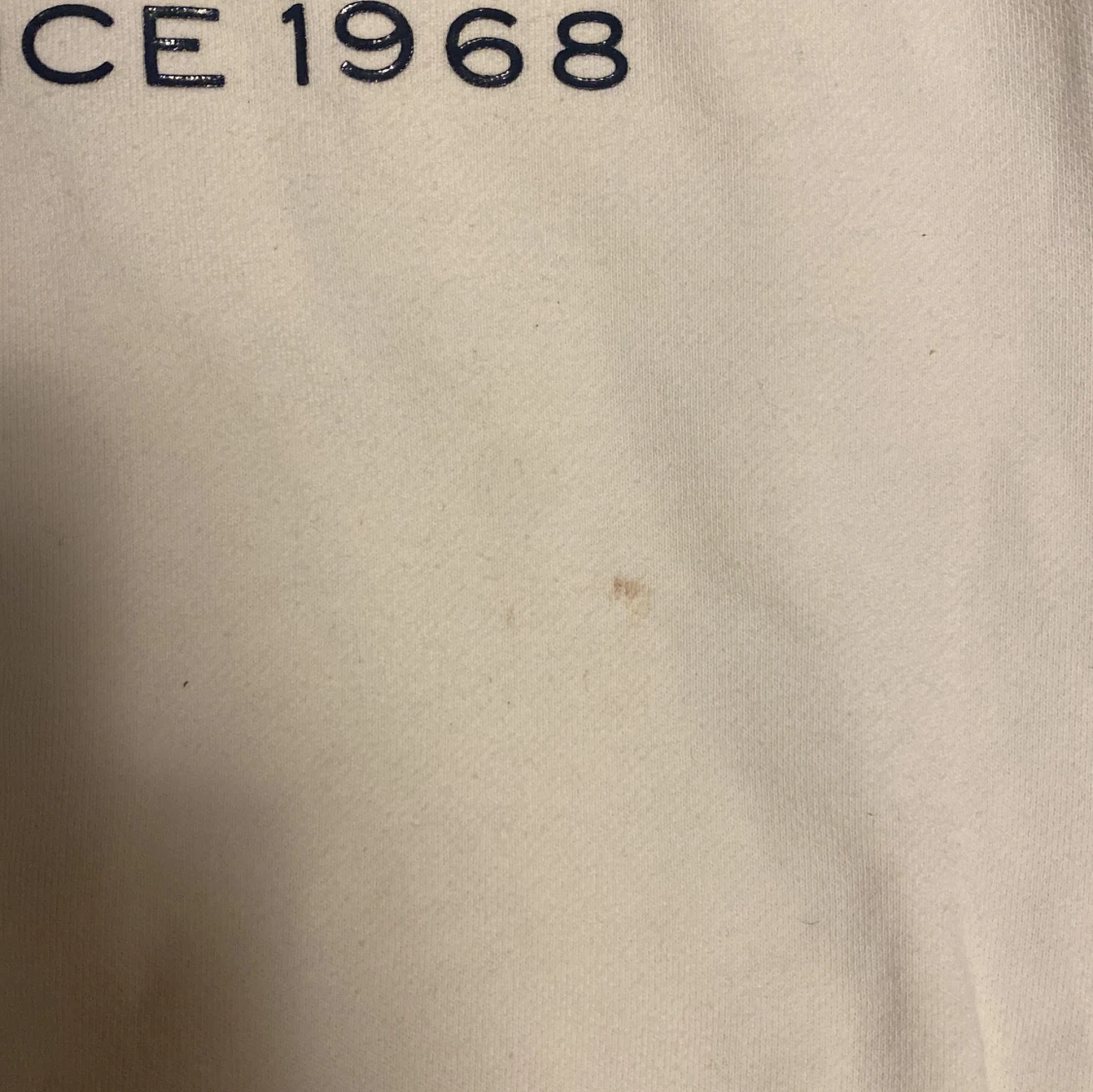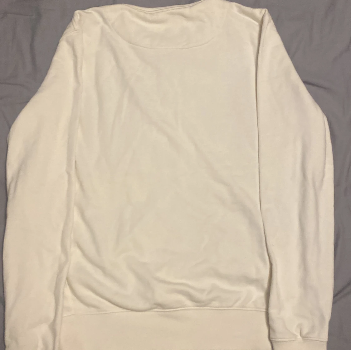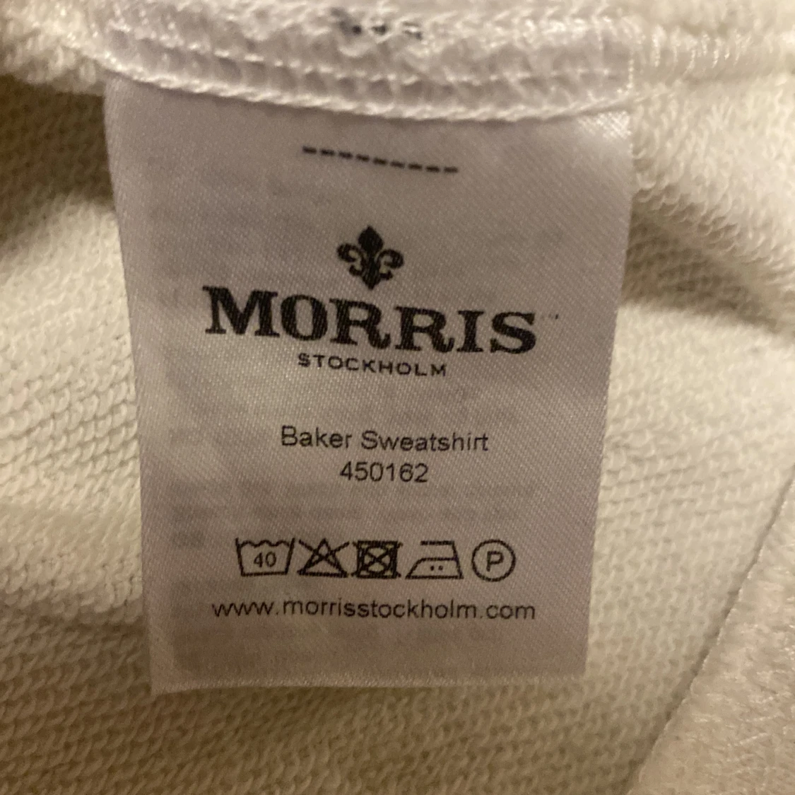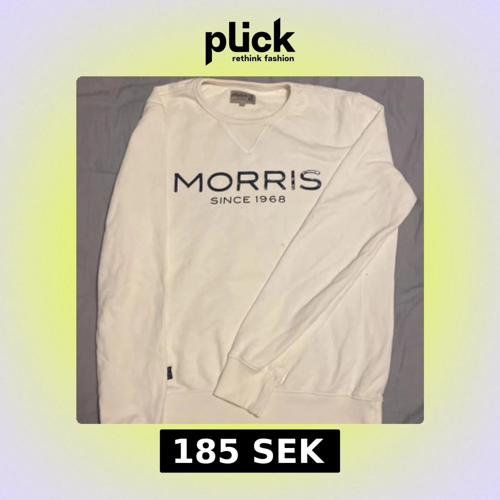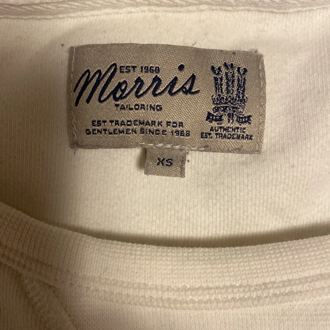 Jag säljer en vit Morris tröja. Med en text på framsidan, Tröjan är väldigt skön men har en synlig fläck på framsidan.