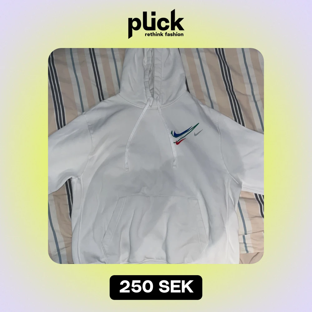 Säljer en snygg vit hoodie från Nike i storlek L. Den har en klassisk design med en färgglad Nike-logga i blått, grönt och rött på bröstet. Perfekt för både vardag och träning. Hoodien har en stor ficka framtill och justerbar huva.