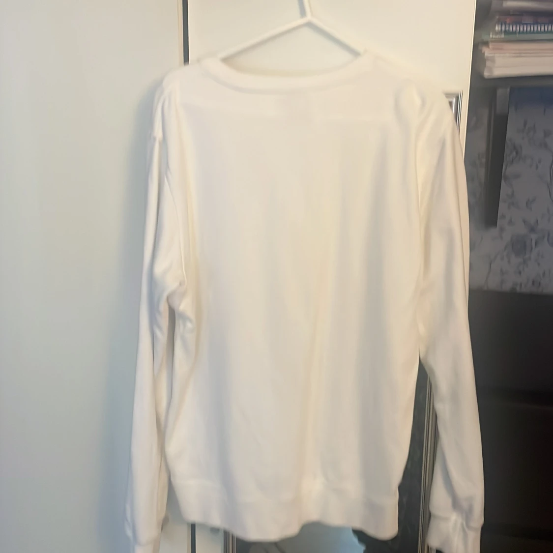 Snygg vit sweatshirt från Nike med klassisk svart swoosh-logga på bröstet. Tröjan har rund halsringning och långa ärmar. Perfekt för en clean och sportig look. Tillverkad i mjukt material som känns skönt mot huden.