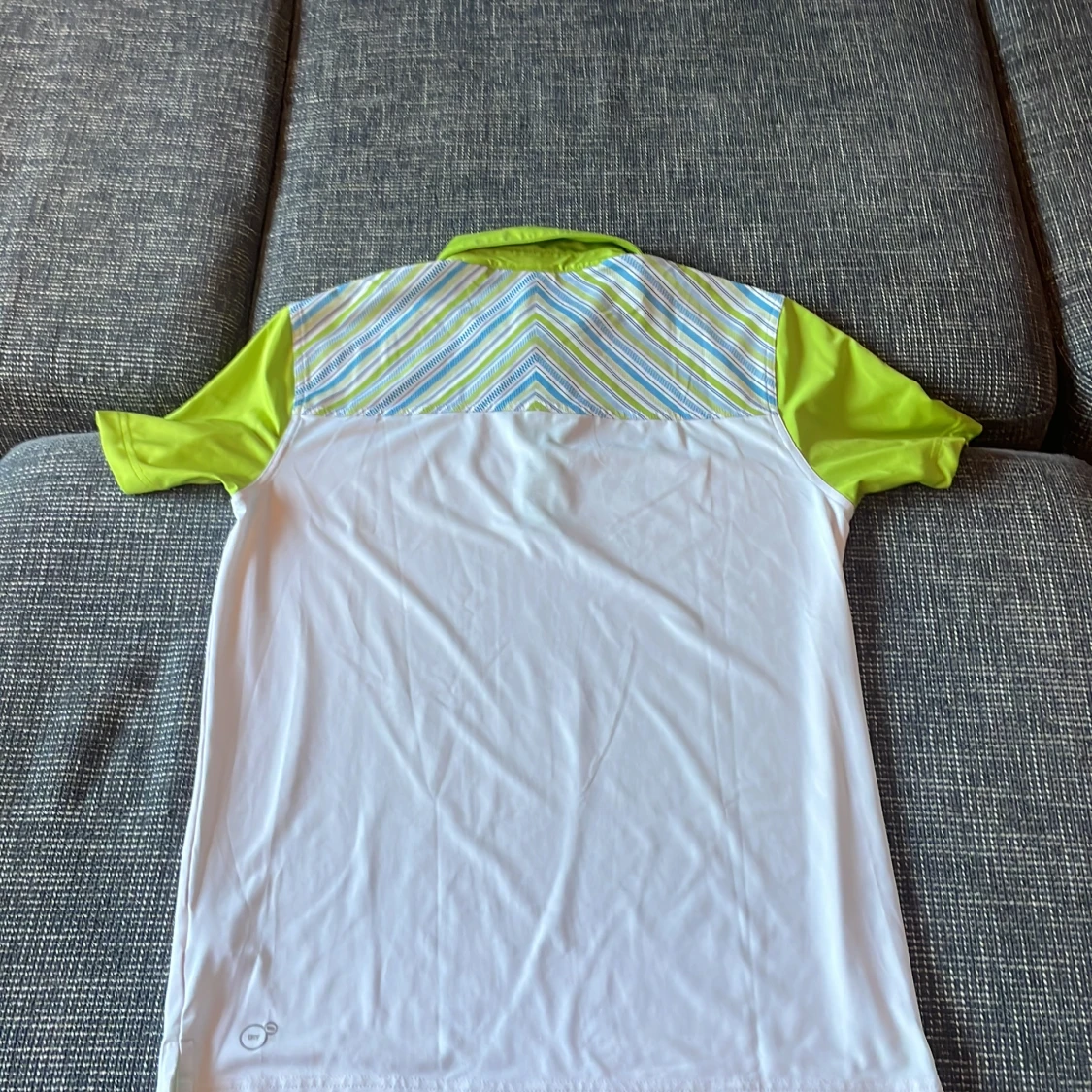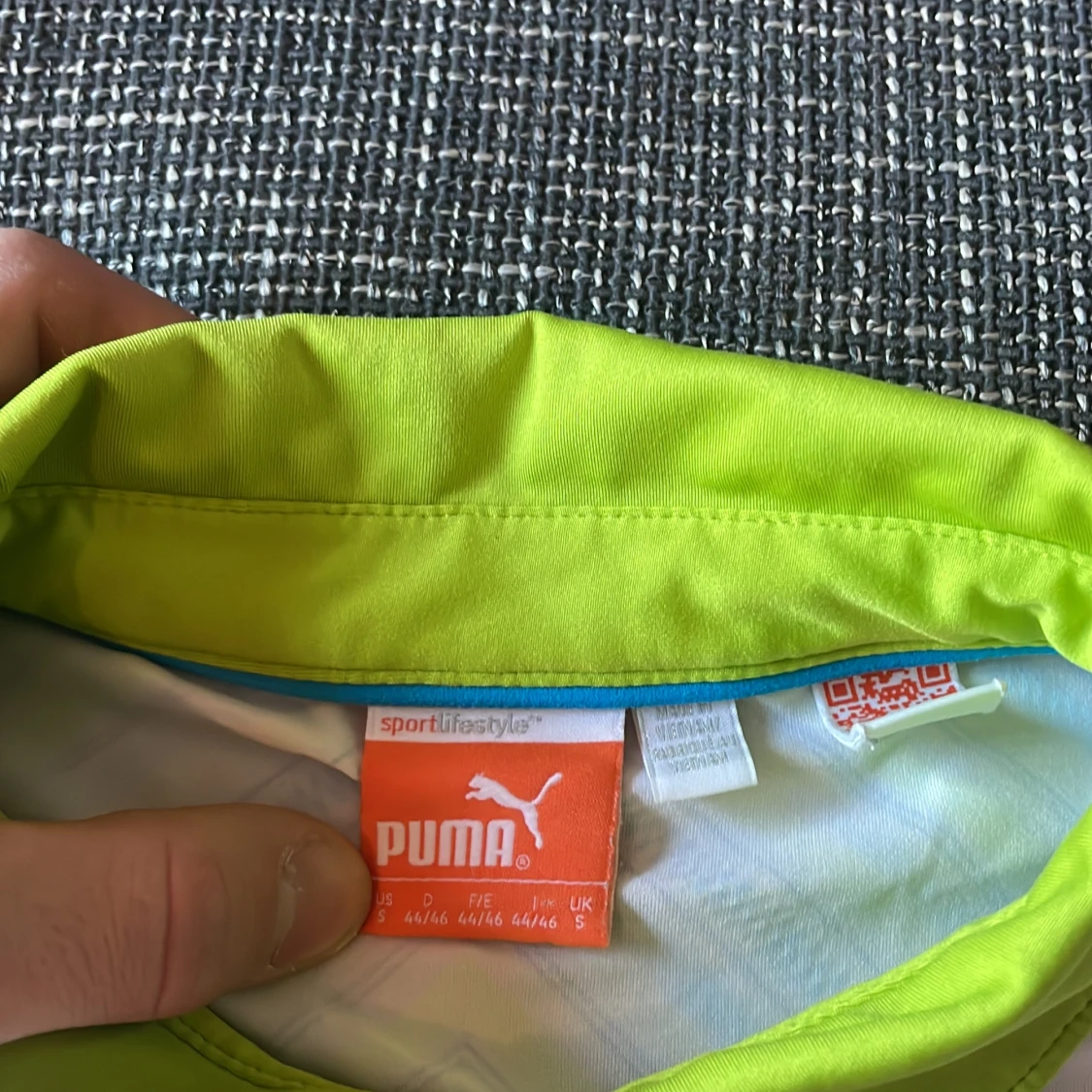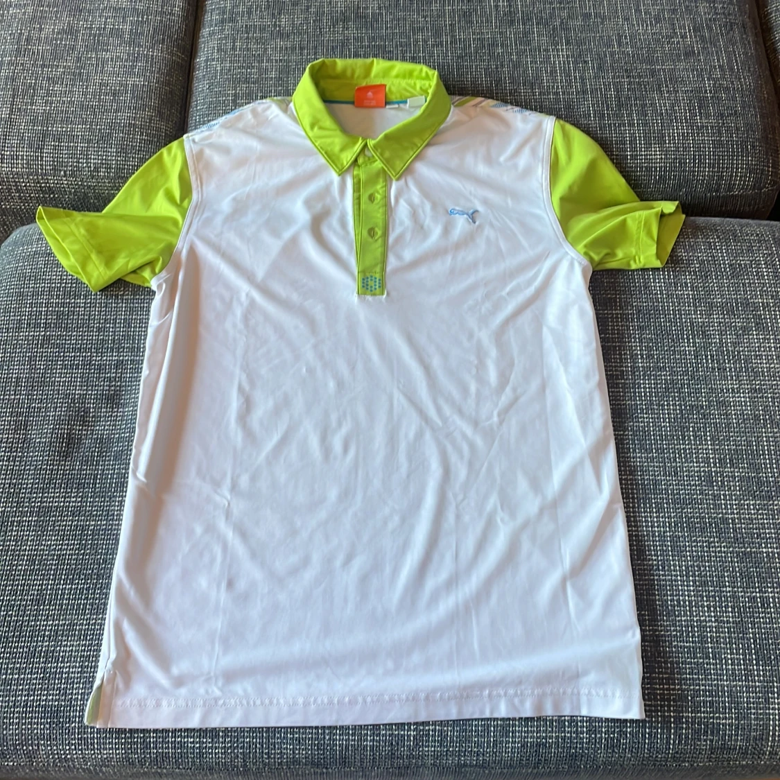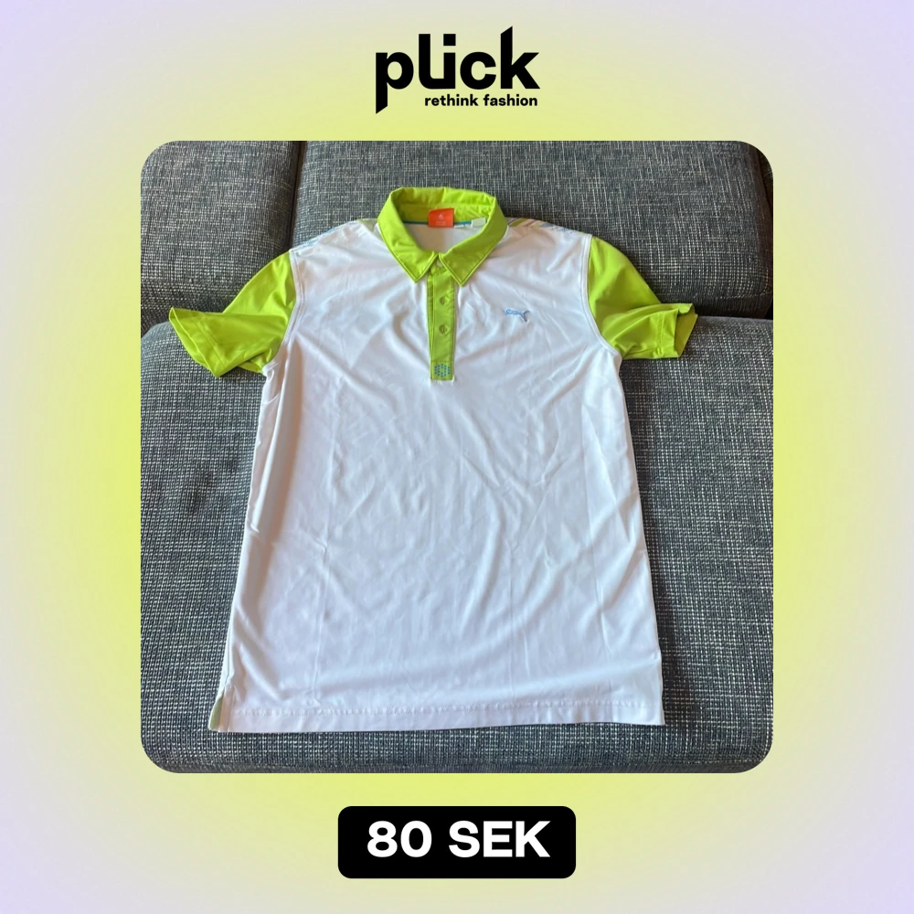 Säljer en snygg vit och limegrön pikétröja från Puma. Perfekt för sportiga aktiviteter med sin lätta och bekväma passform. Tröjan har korta ärmar och en klassisk krage med knappar. Baksidan har ett coolt mönster i olika färger. Passar perfekt för vår och sommar! Pris går allltid att förhandlas!