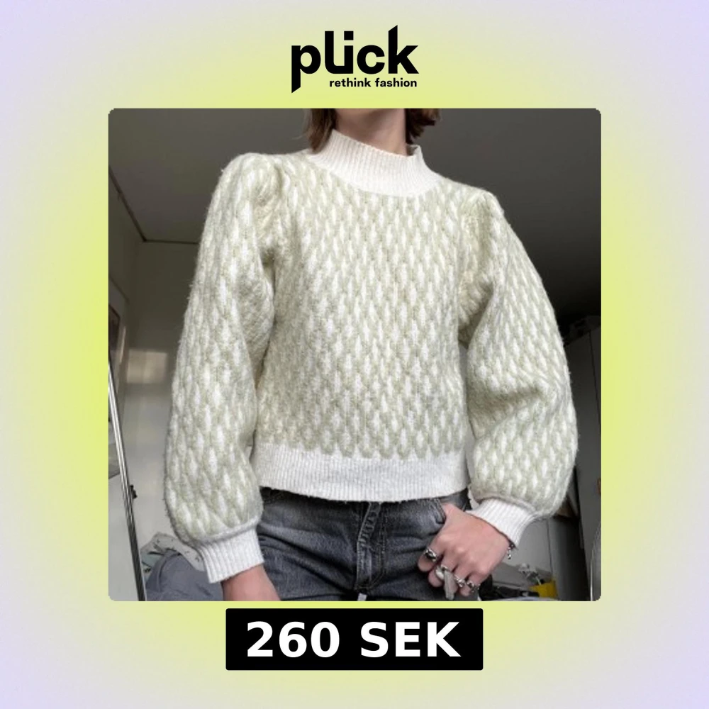 Supermysig stickad tröja från ASOS i vit och ljusgrön färg med mönstrad struktur. Tröjan har puffiga långärmar, ribbade muddar och hög ribbad krage. Perfekt för dig som gillar en chill och trendig look med lite volym i ärmarna.