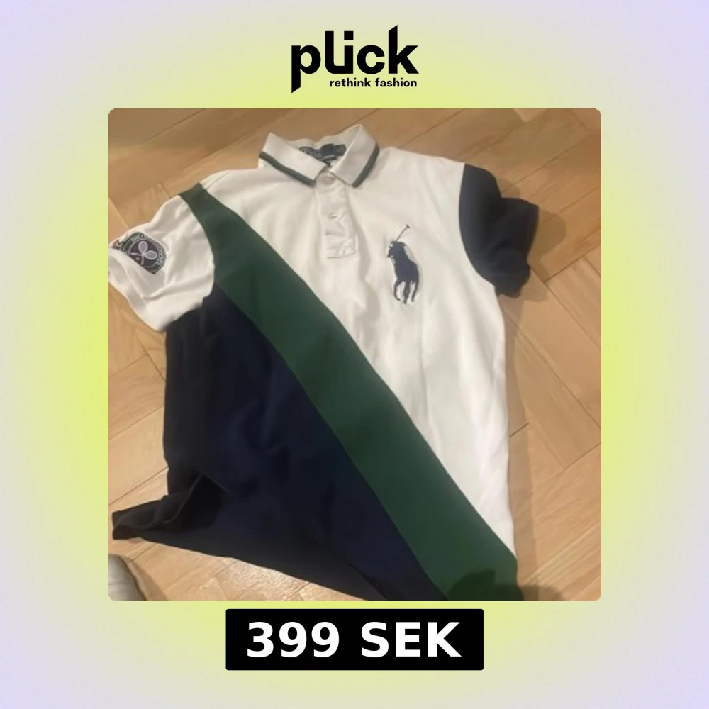 Säljer en snygg pikétröja från Ralph Lauren i vitt och marinblått med en grön diagonal rand. Tröjan har korta ärmar och en broderad logga på bröstet samt ett Wimbledon-märke på ärmen. Perfekt för en sportig look!