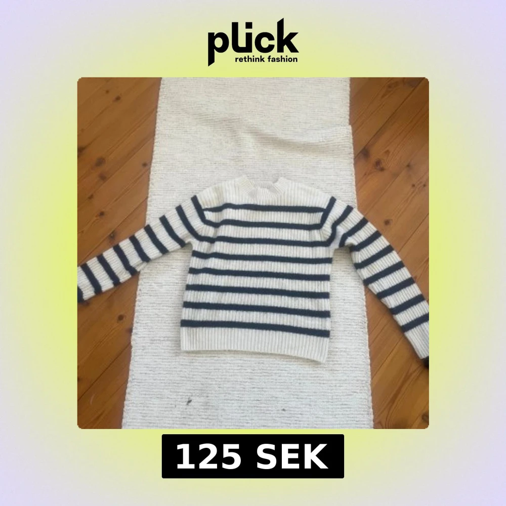 Säljer en stickad tröja från H&M i vitt med marinblåa horisontella ränder. Tröjan har rund halsringning, långa ärmar och ribbade muddar. Perfekt för en avslappnad och stilren look.