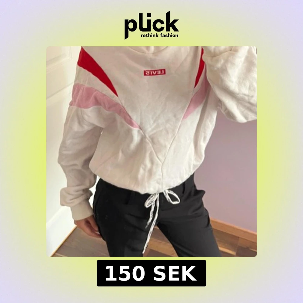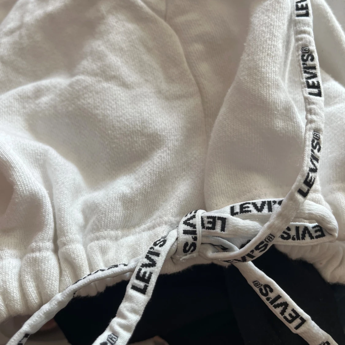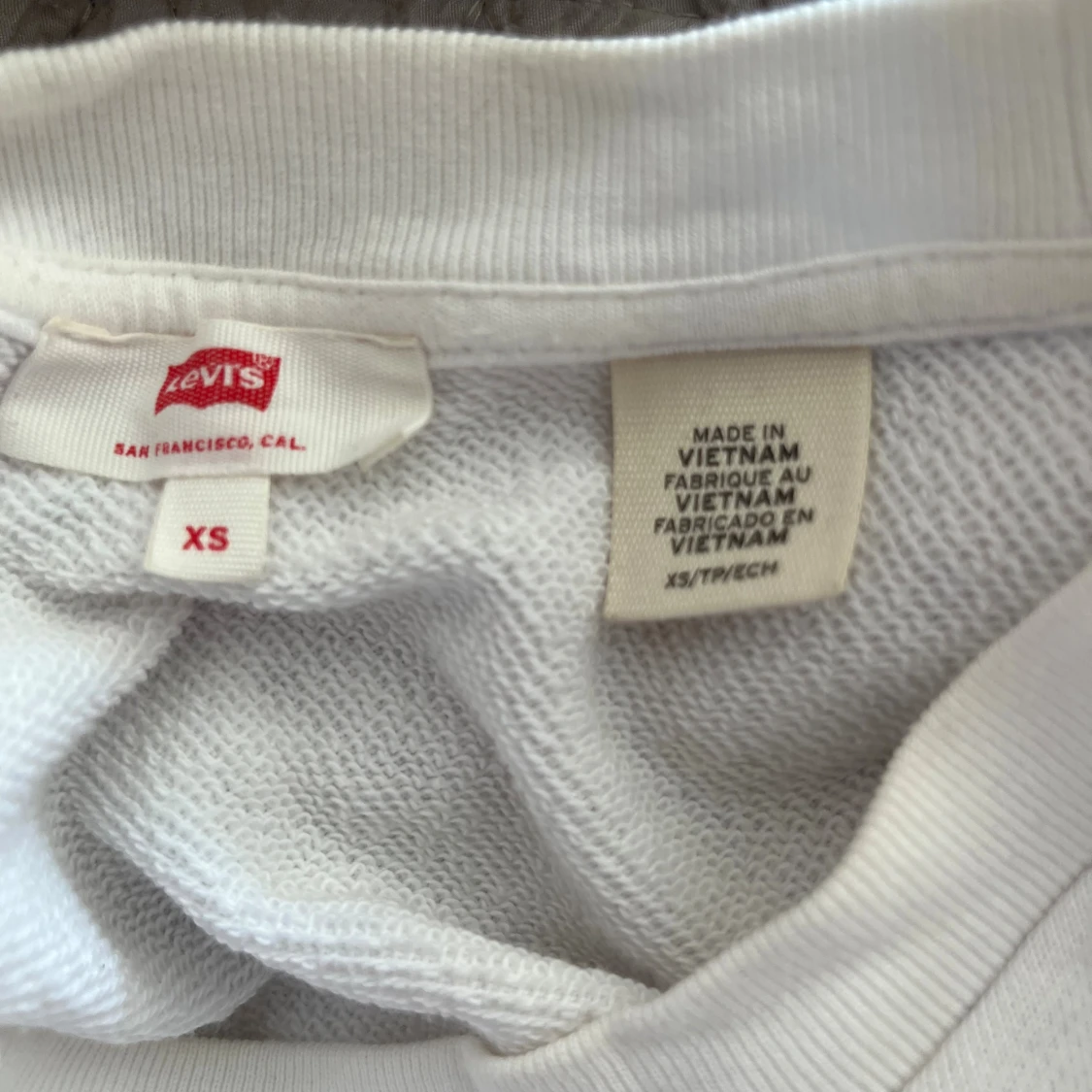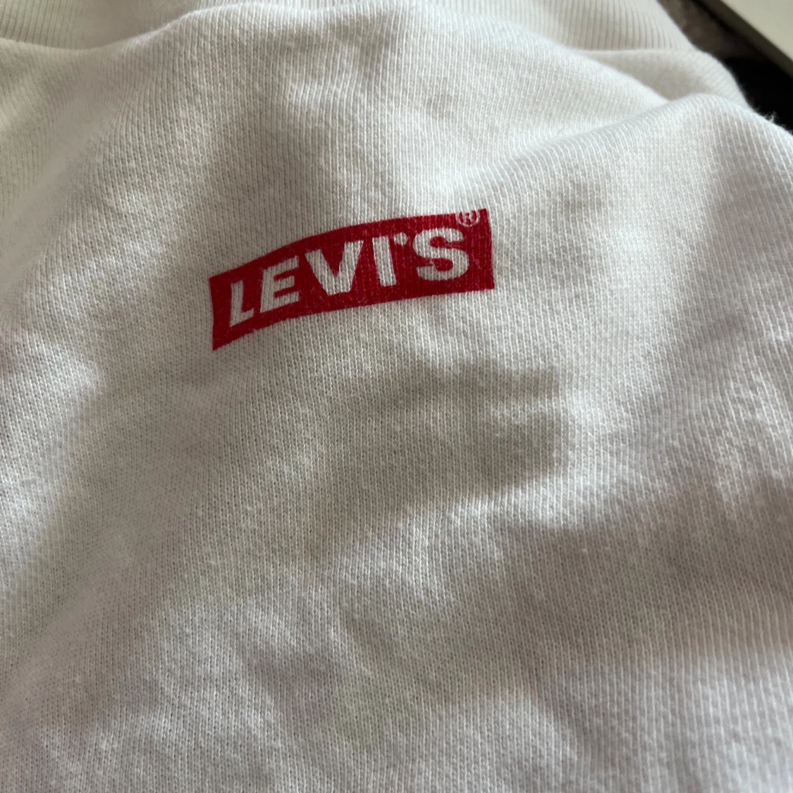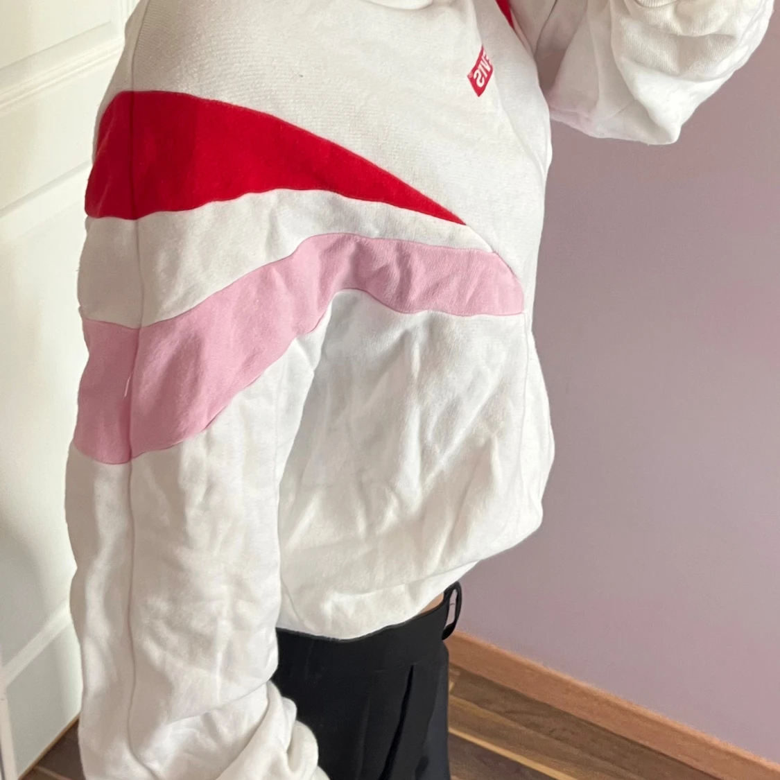 Säljer en snygg vit sweatshirt från Levi's i storlek XS med röda och rosa detaljer i ett coolt mönster över bröstet och ärmarna. Tröjan har lång ärm, snörning med Levi's-logga i midjan och är gjord i mjuk bomull. Perfekt för dig som gillar streetstyle och färg.