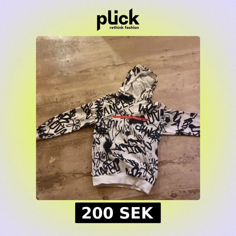 Säljer en fett snygg hoodie från WOXO 720° i storlek 146/152. Den är vit med svart graffiti-inspirerat tryck över hela tröjan och har en huva. Materialet är mjukt och känns som bomull. Perfekt för dig som gillar streetstyle och vill sticka ut.