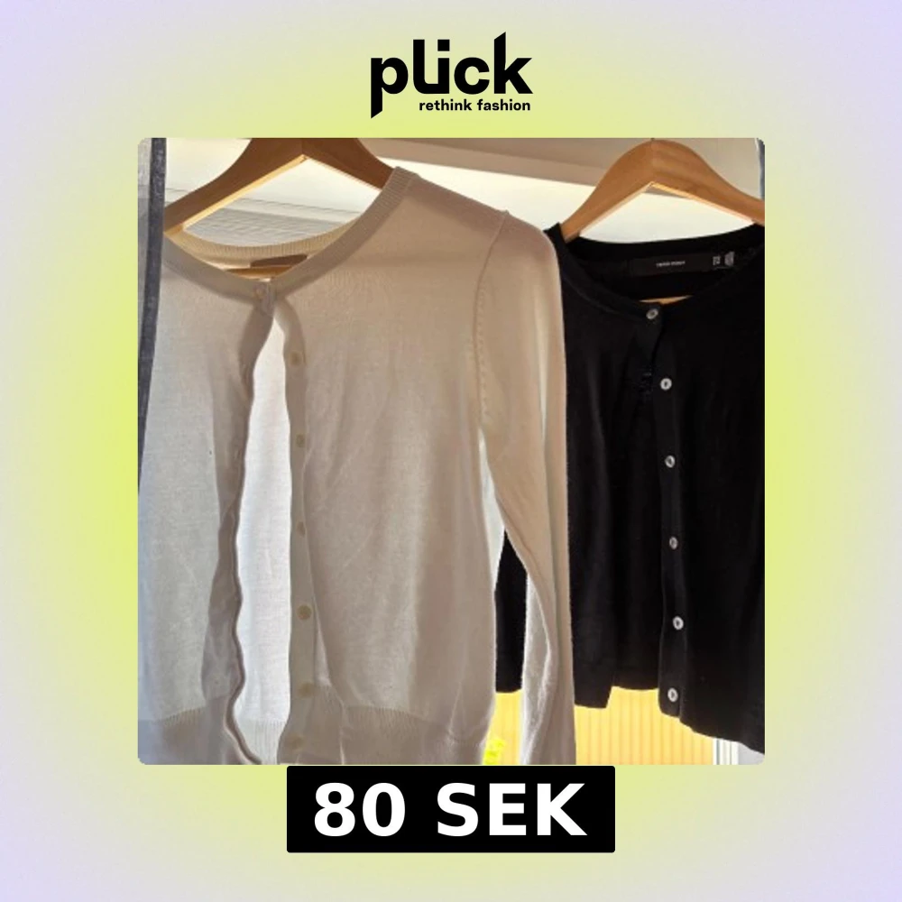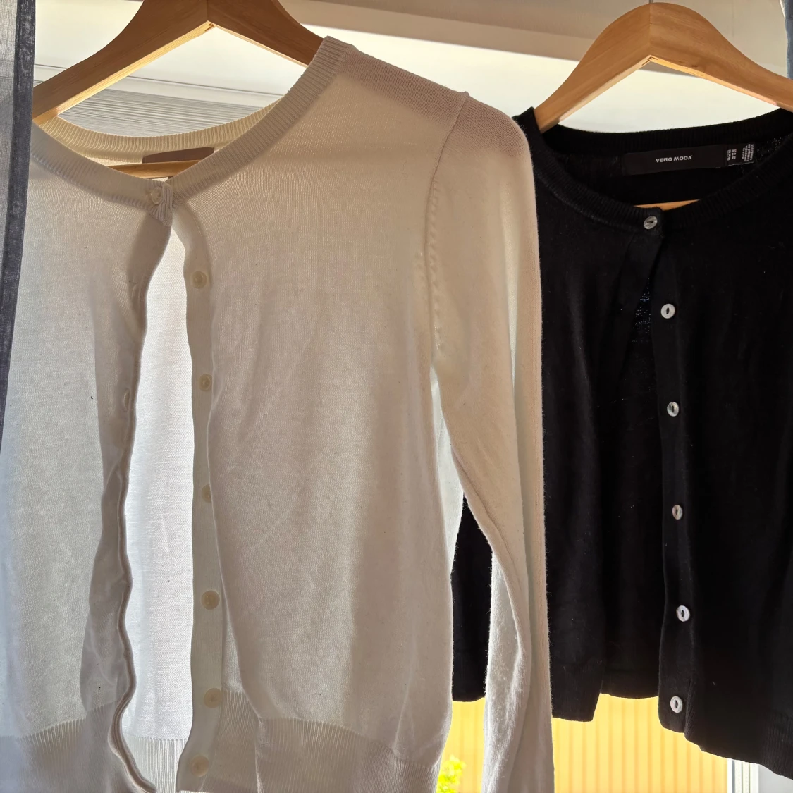 Klassisk vit och svart kofta med rund hals och knäppning framtill. Långärmad och i mjukt, tunt material som passar perfekt till lager-på-lager. Stilren och enkel design som funkar till många outfits. Den vita är i S från H&M och den svarta är Xs från vero moda