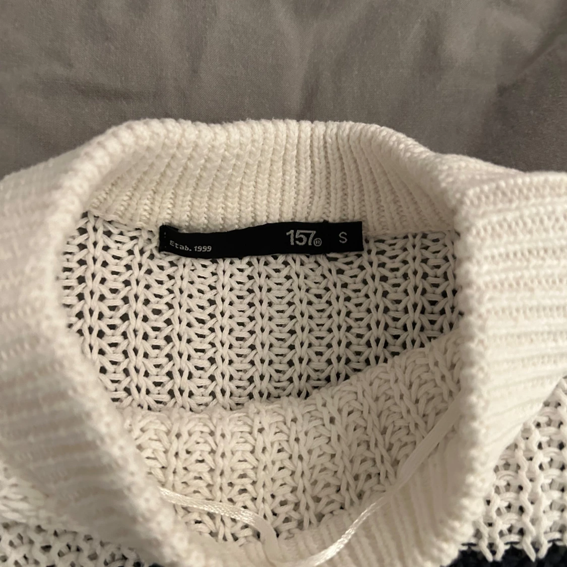 Säljer en snygg vit stickad tröja från 157 med svarta ränder. Tröjan har en avslappnad passform och långa ärmar, perfekt för kyligare dagar. Den är både stilren och bekväm. Nästan aldrig använd. Köparen står för frakten.