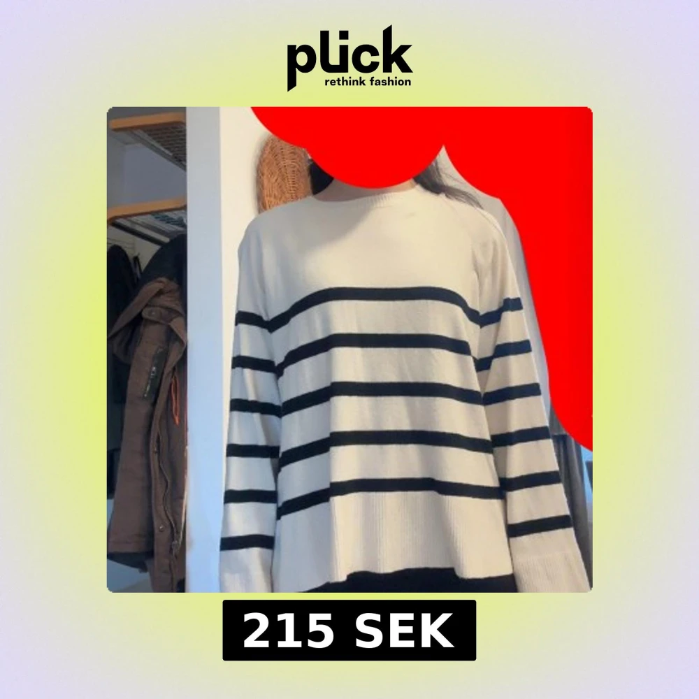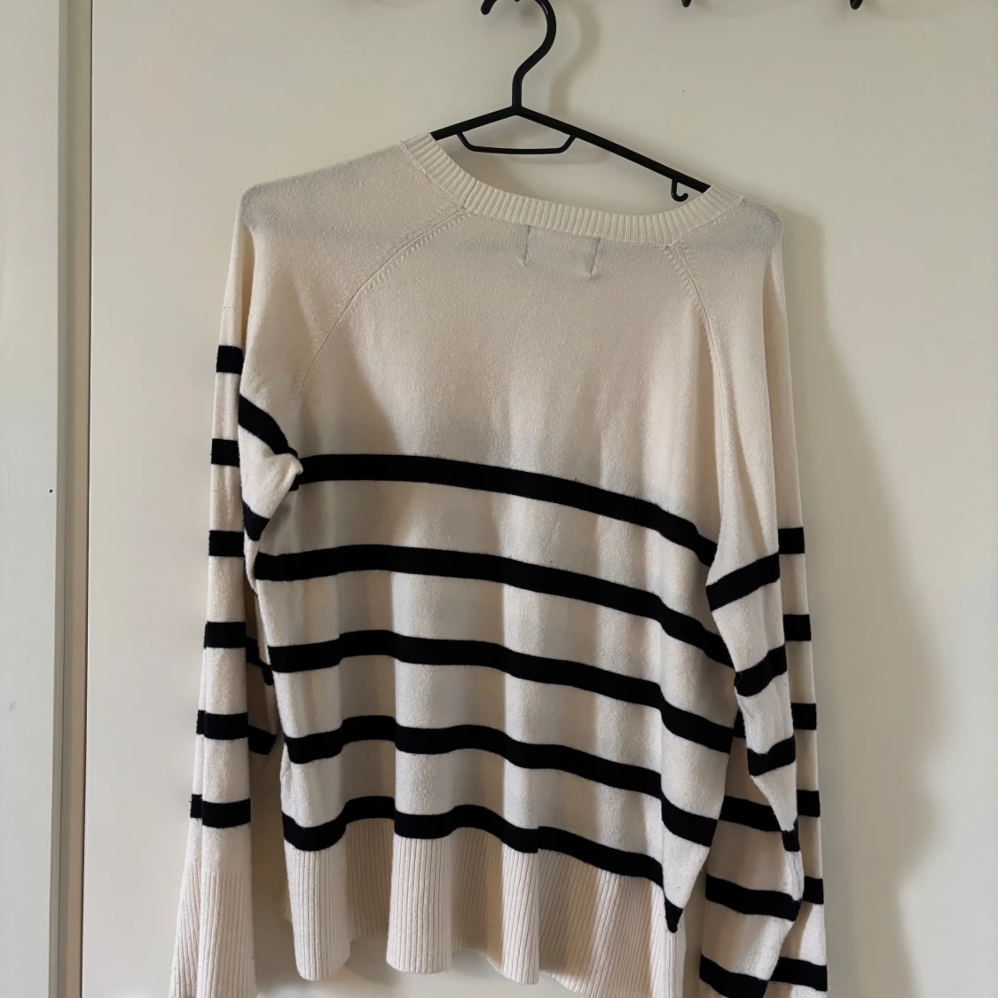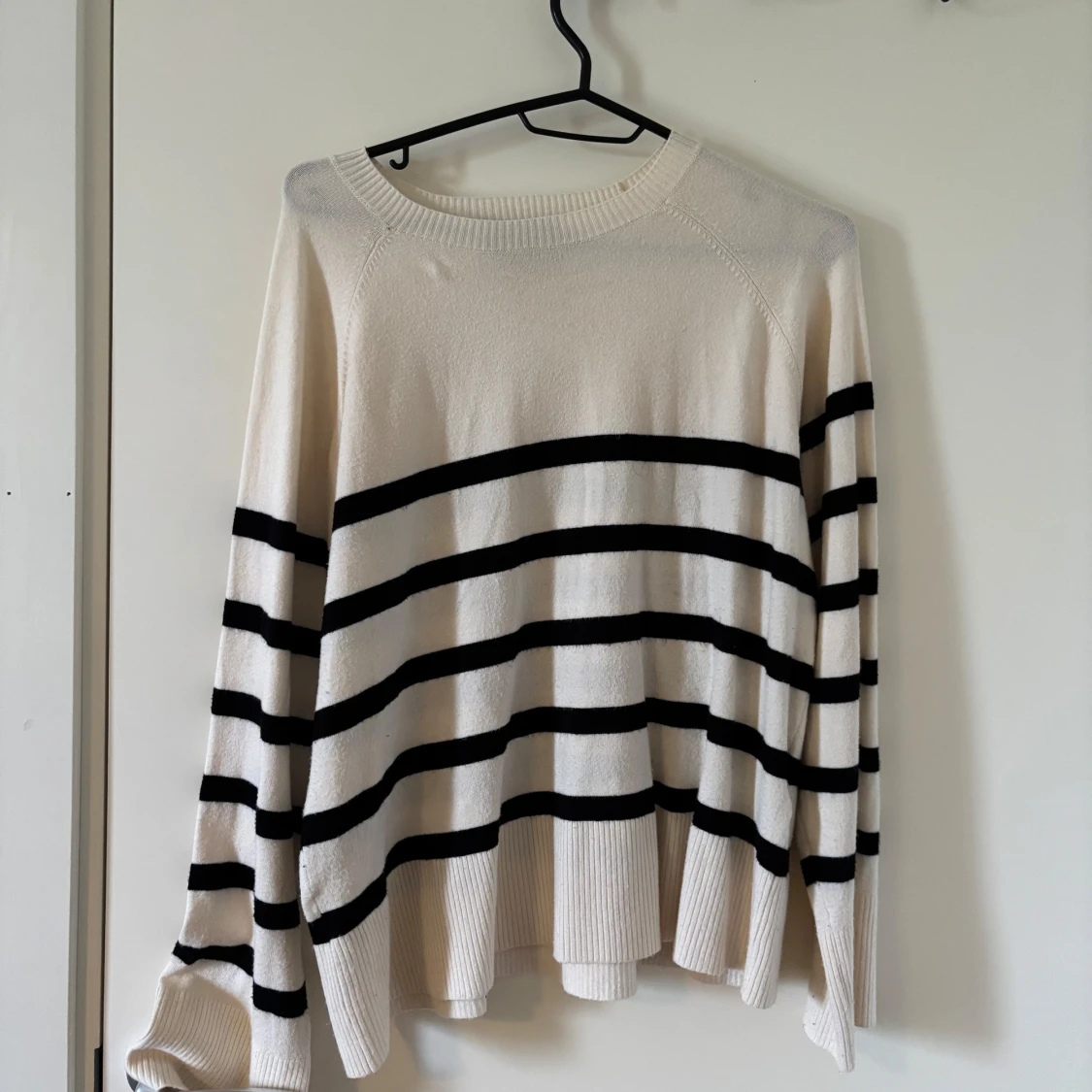 Säljer en vit stickad tröja med svarta horisontella ränder. Tröjan har rund halsringning och långa ärmar. Perfekt för en avslappnad och stilren look.