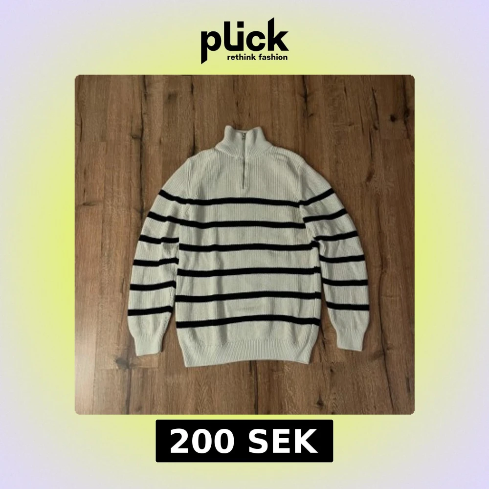 Snygg vit tröja med blå ränder och en halv dragkedja vid halsen. Perfekt för en stilren look. Tröjan har långa ärmar och är ribbad för extra komfort.