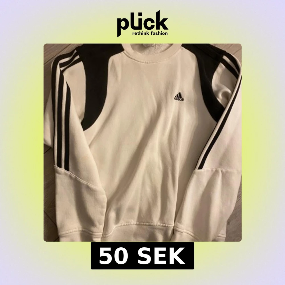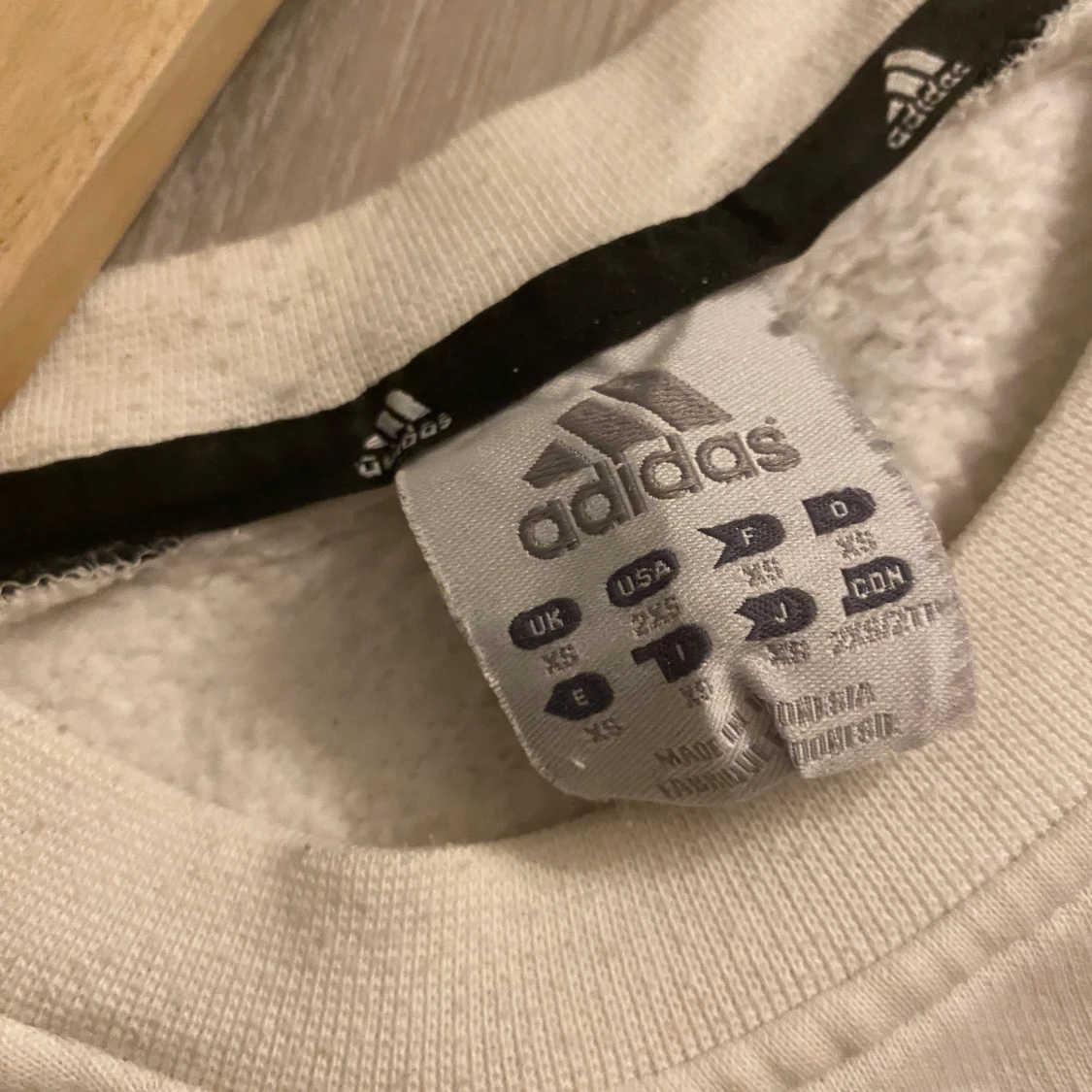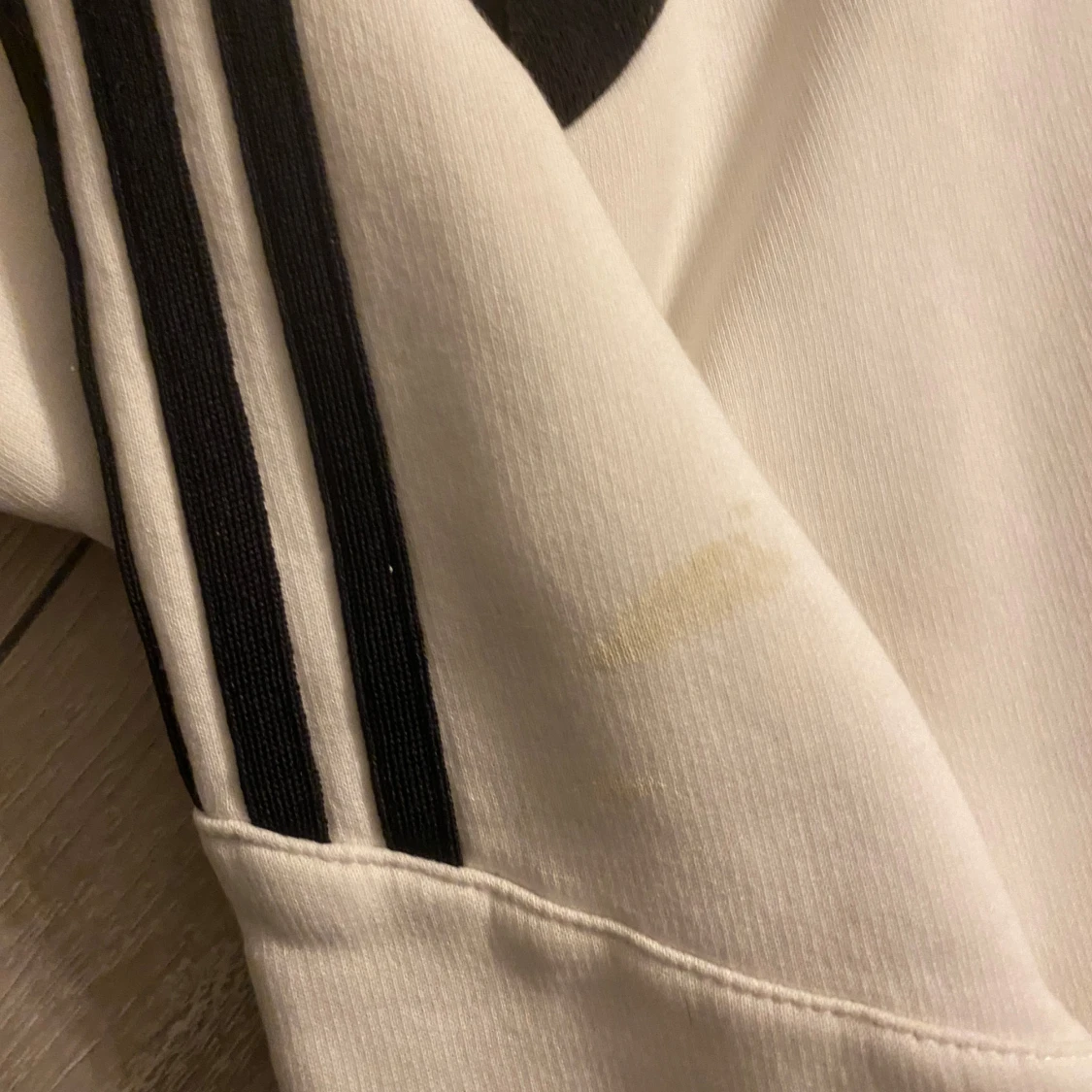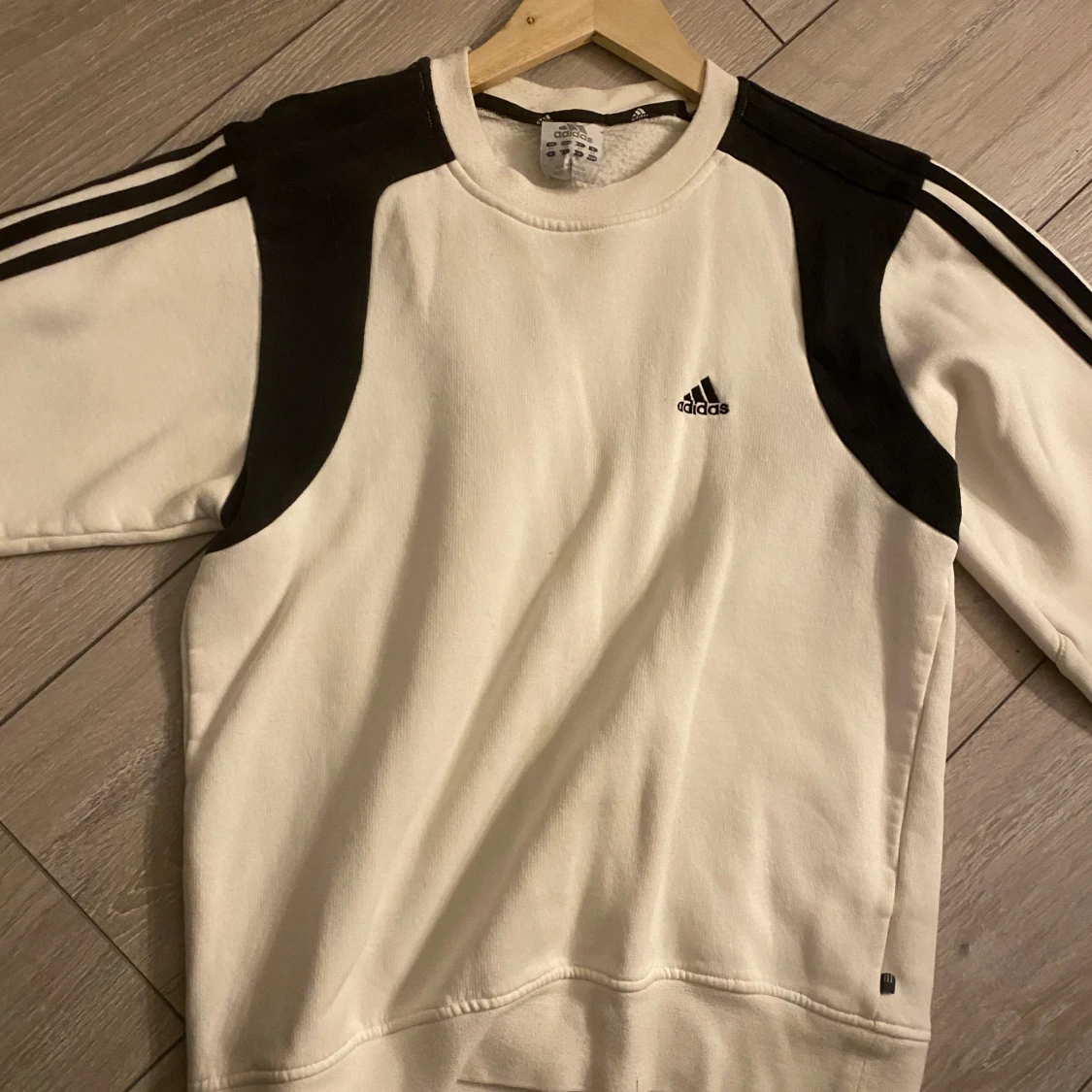 Säljer en vit och svart tröja från Adidas med klassiska tre ränder längs ärmarna. Tröjan har en rund hals och långa ärmar. Perfekt för en sportig look eller avslappnad stil. Adidas-loggan är broderad på bröstet. Liten defekt vid ärmen vet ej om den går att få bort, strl xs