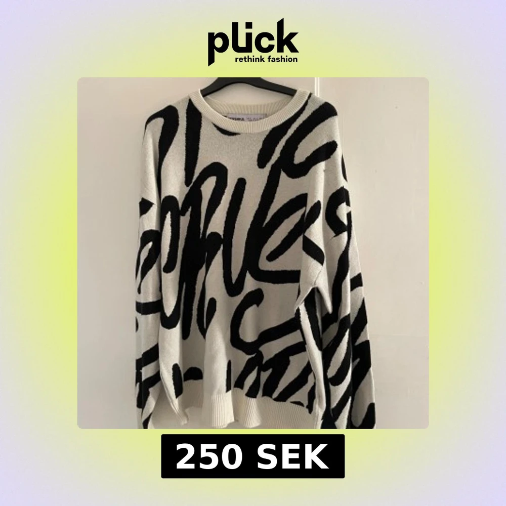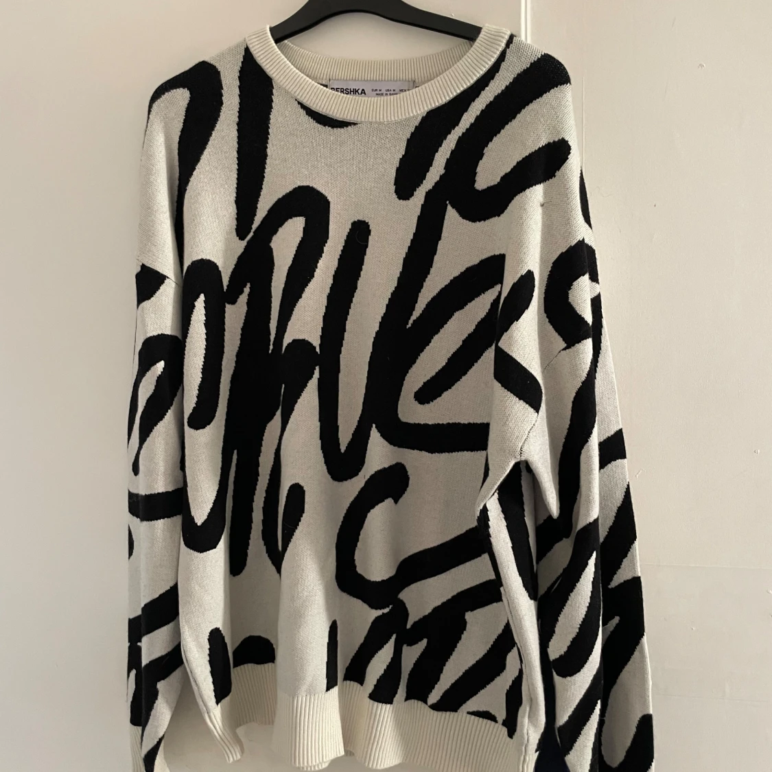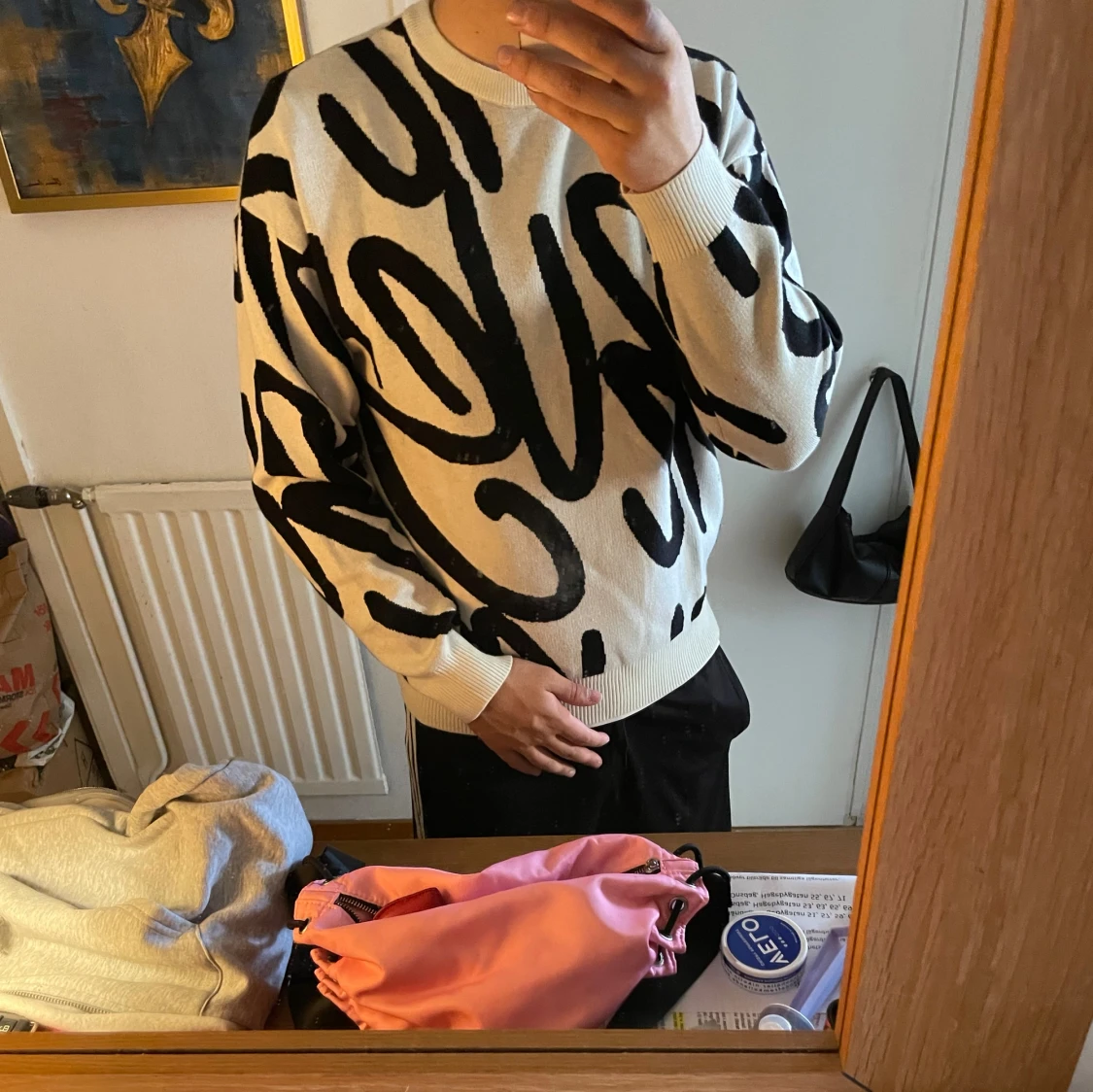 Säljer en vit tröja från Bershka med stora svarta grafiska mönster. Tröjan har rund halsringning, långa ärmar och ribbade muddar. Skön passform och perfekt för dig som gillar statement-plagg med streetkänsla.
