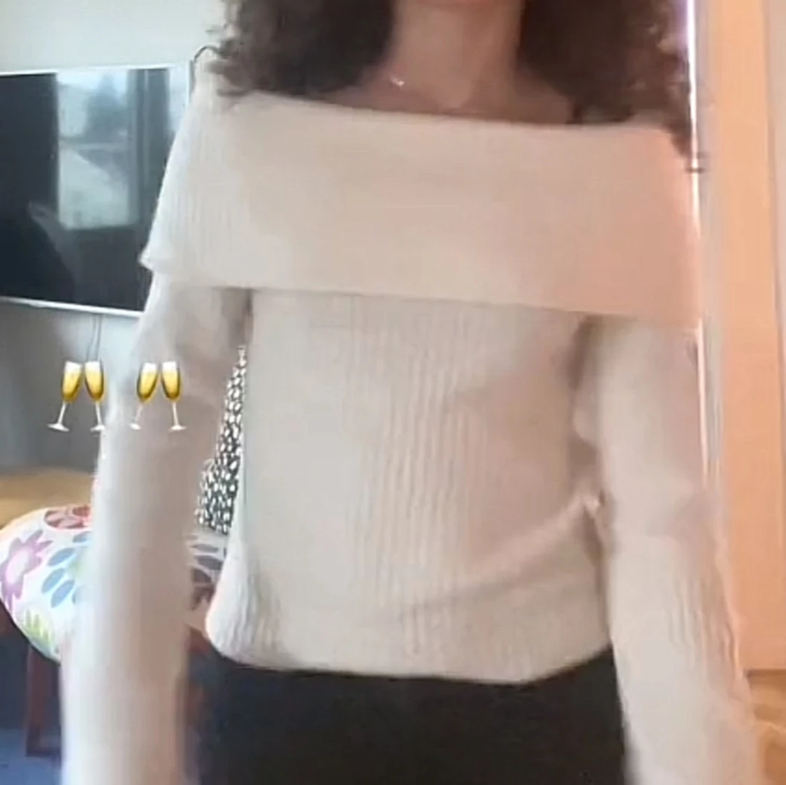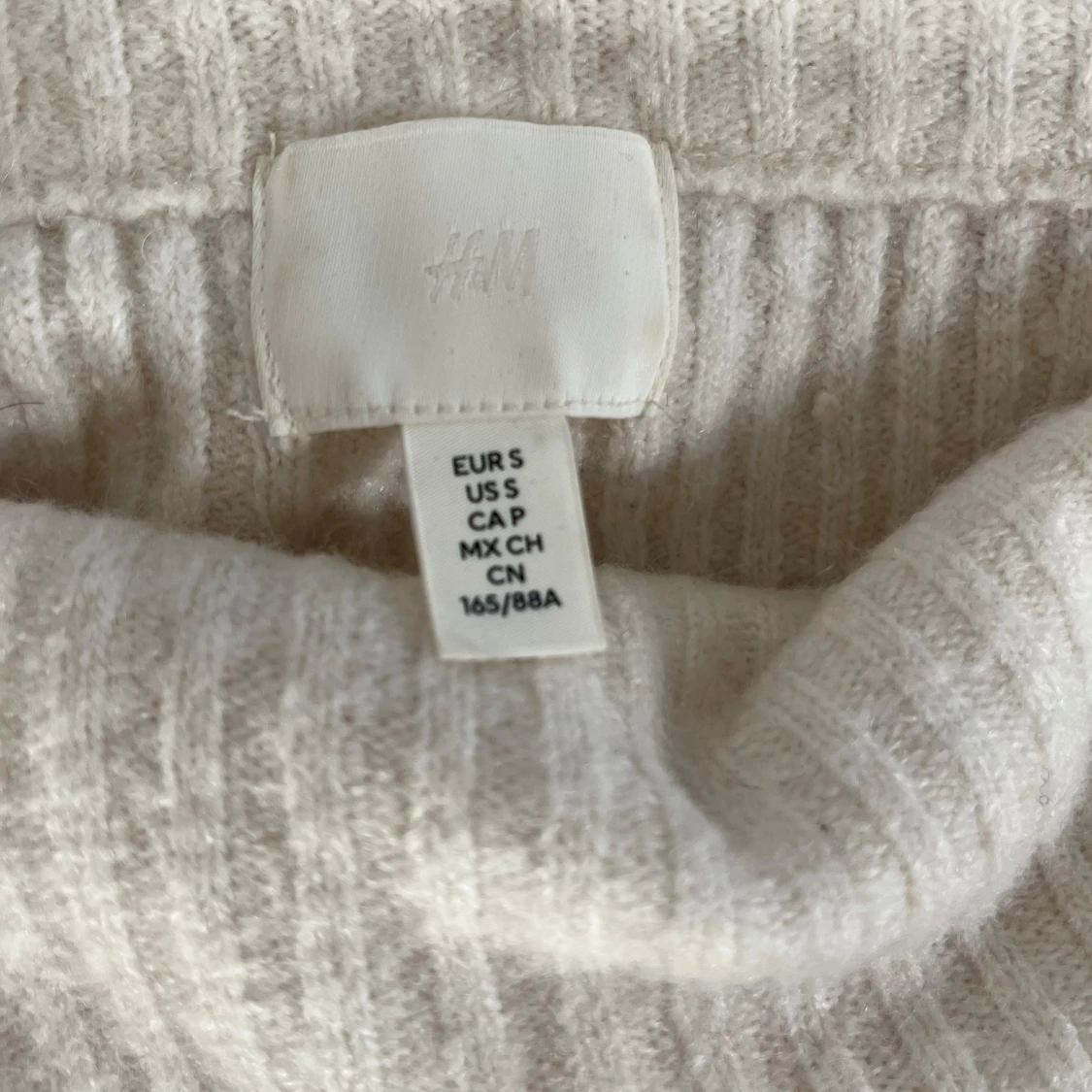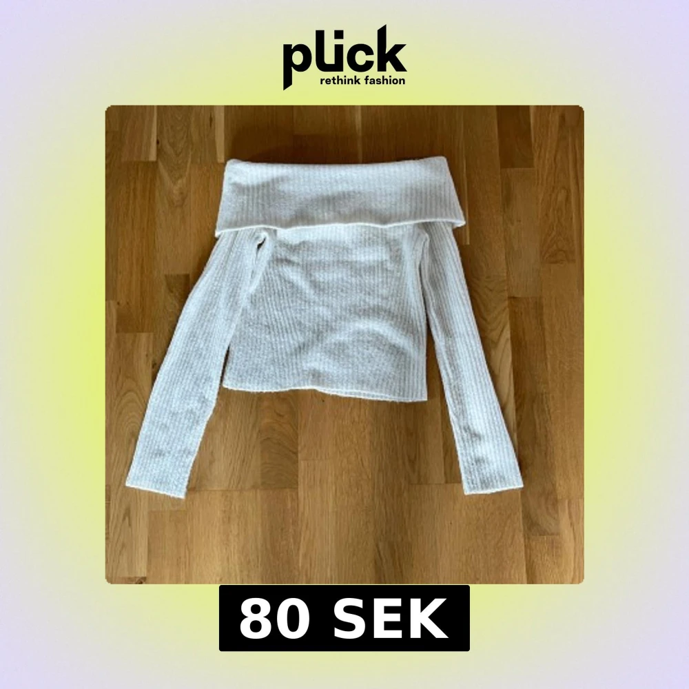 Säljer en vit stickad offshoulder-tröja från H&M i storlek S. Tröjan har ribbad struktur och långa ärmar, perfekt för att skapa en stilren och trendig look.