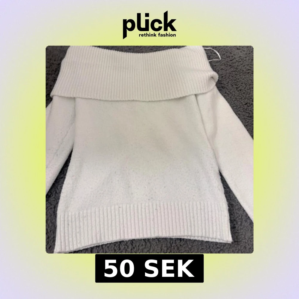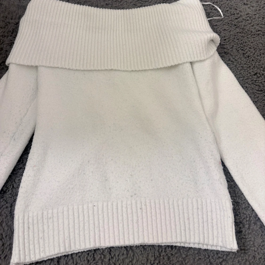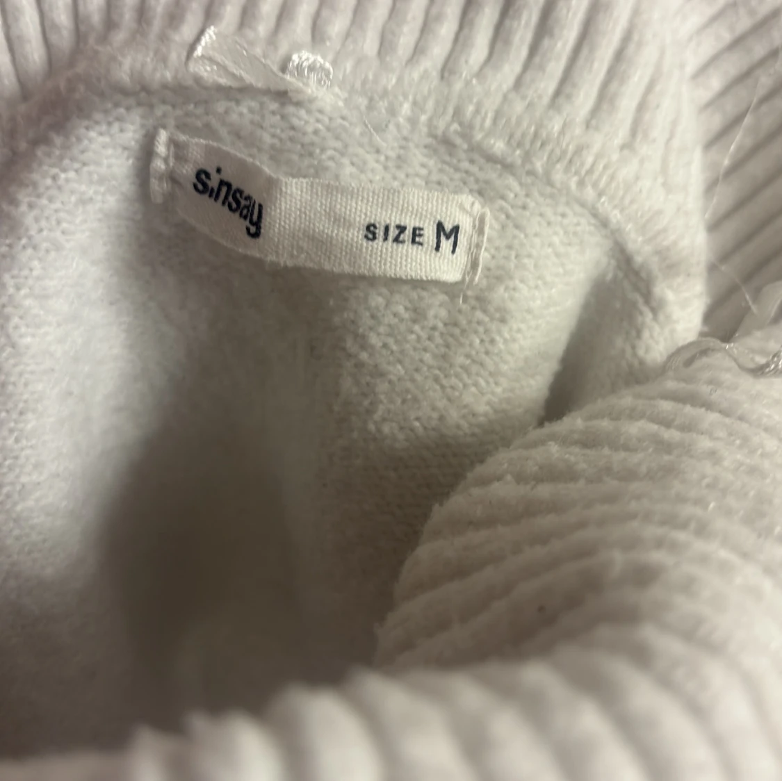 Supermysig vit stickad tröja från Sinsay i storlek M. Tröjan har en bred ribbad offshoulder-krage och långa ärmar.