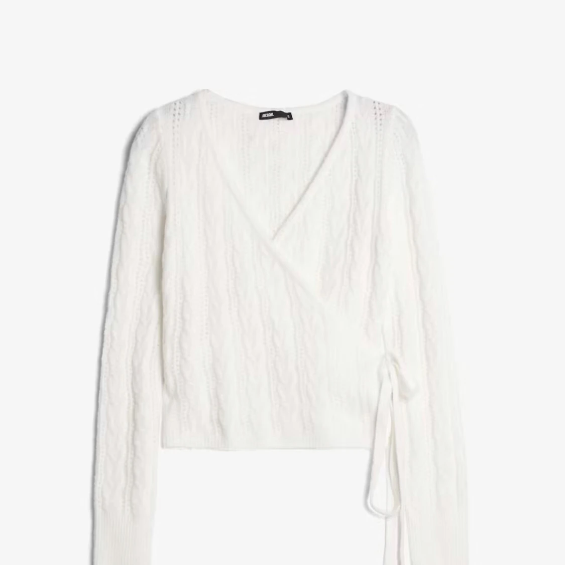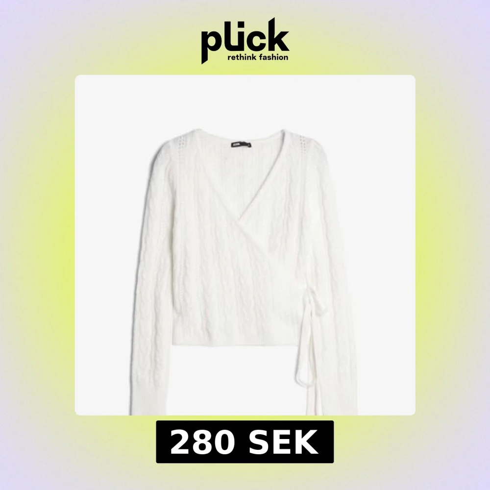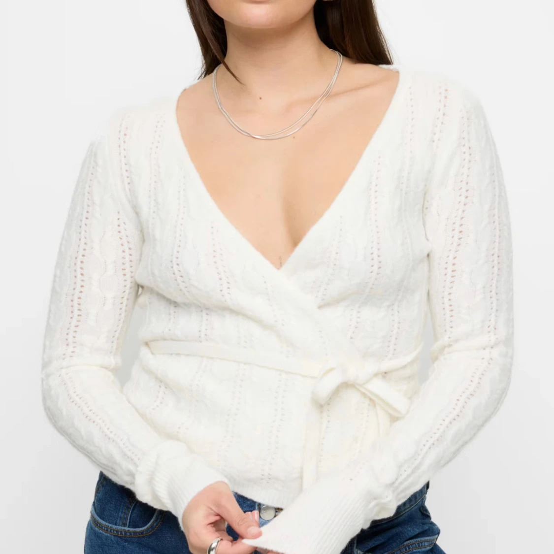 Supergullig vit stickad omlottkofta från Bikbok med knyt i sidan och v-ringad hals. Koftan har lång ärm och ett snyggt kabelstickat mönster som ger en mysig och trendig look. Jättesöt och levlar upp vilken outfit som helst!❣️Nypris 400 och använd två eller tre gånger