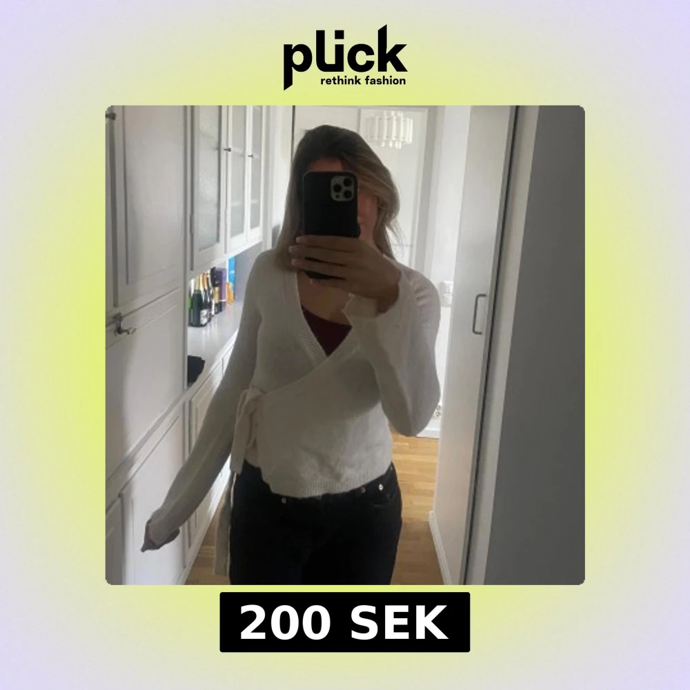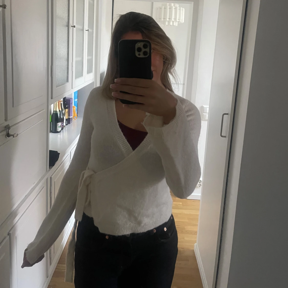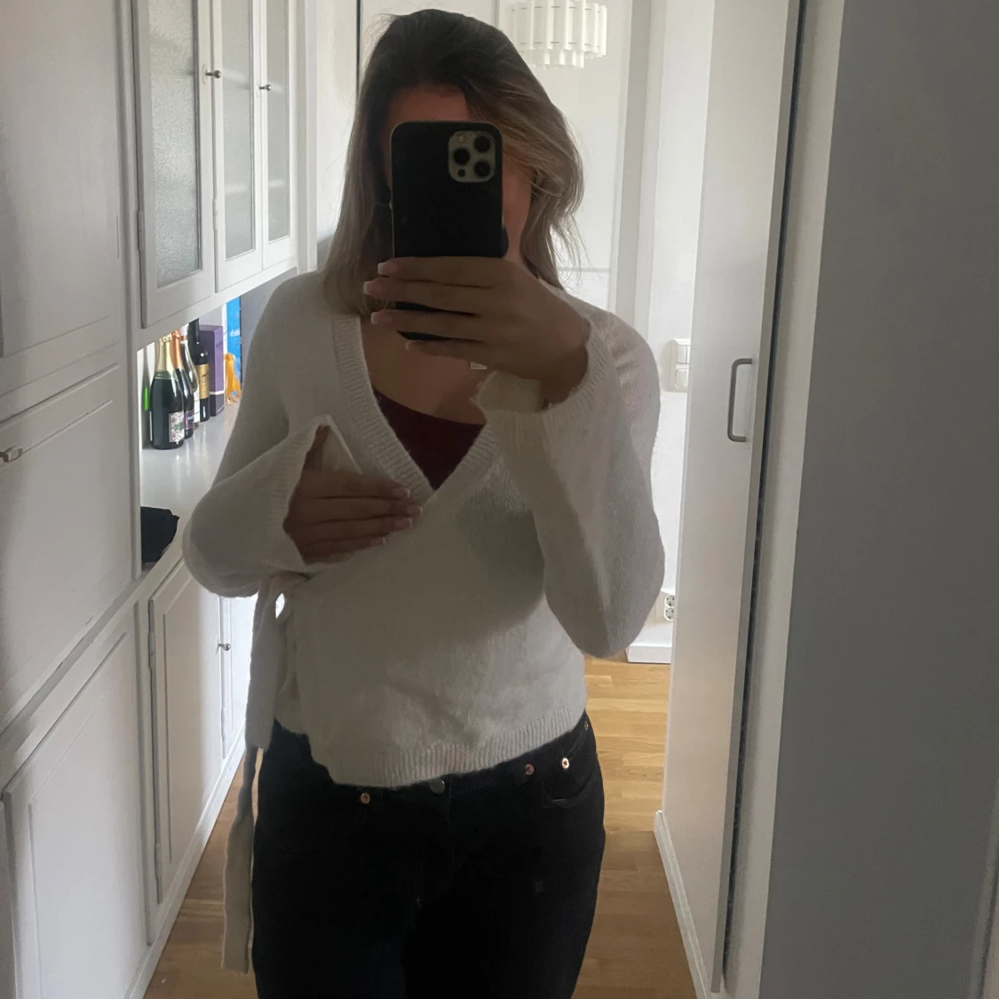 Mysig vit omlottkofta med knytband i sidan och v-ringad hals. Koftan har lång ärm och är stickad i ett mjukt material. Perfekt att slänga på sig över ett linne eller t-shirt för en chill look.