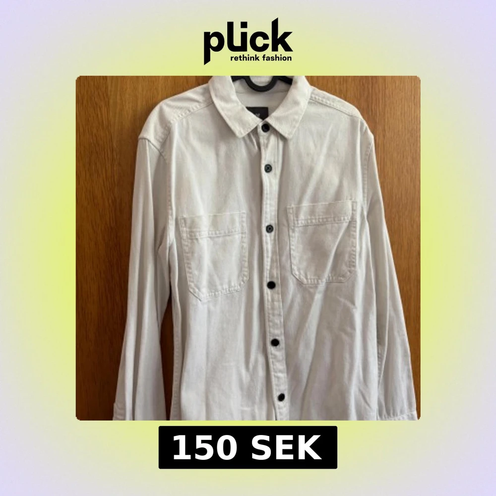 Säljer en stilren vit overshirt från H&M i bomull. Skjortan har två bröstfickor, svarta knappar framtill och klassisk krage. Regular fit och långärmad modell som passar perfekt till lager-på-lager-stil.