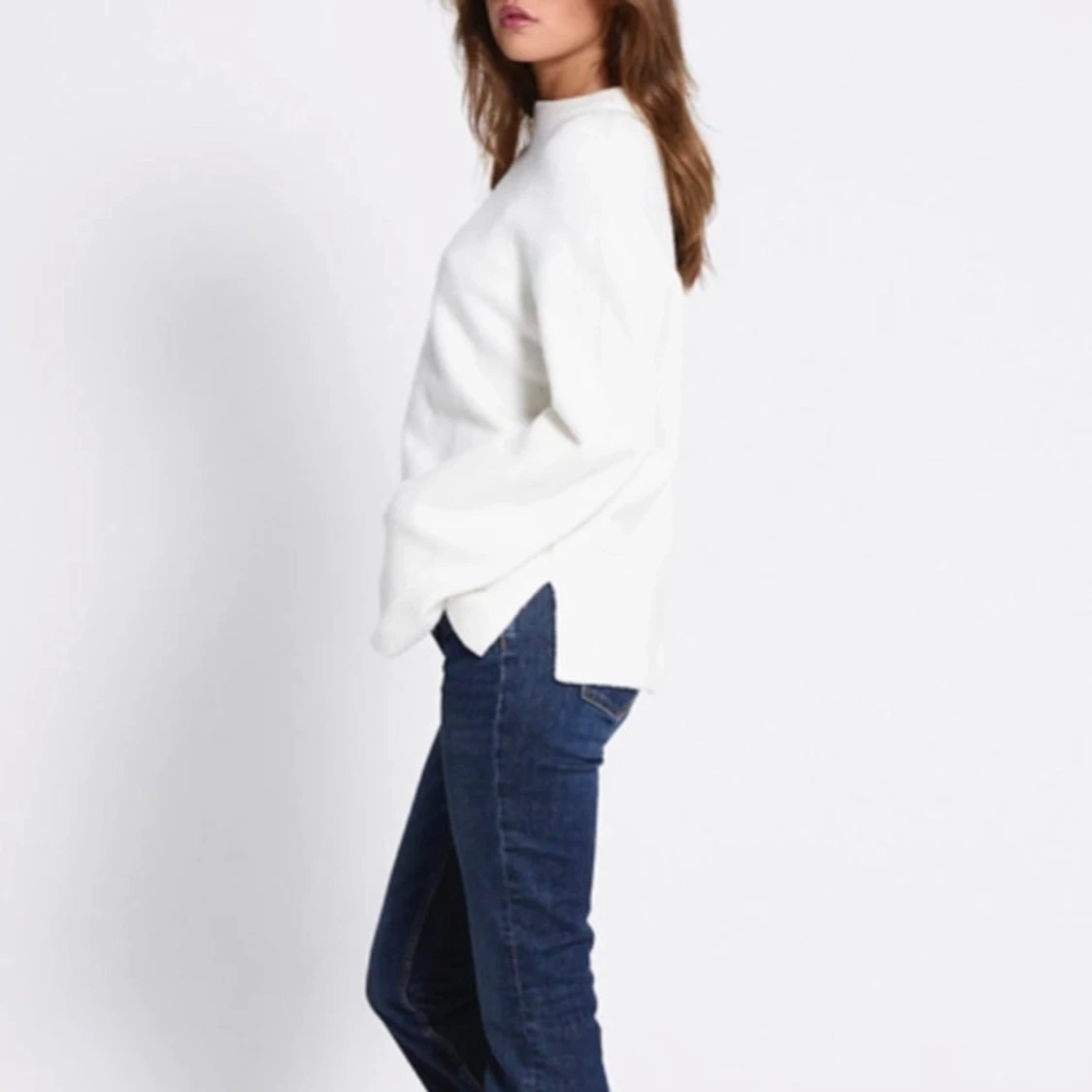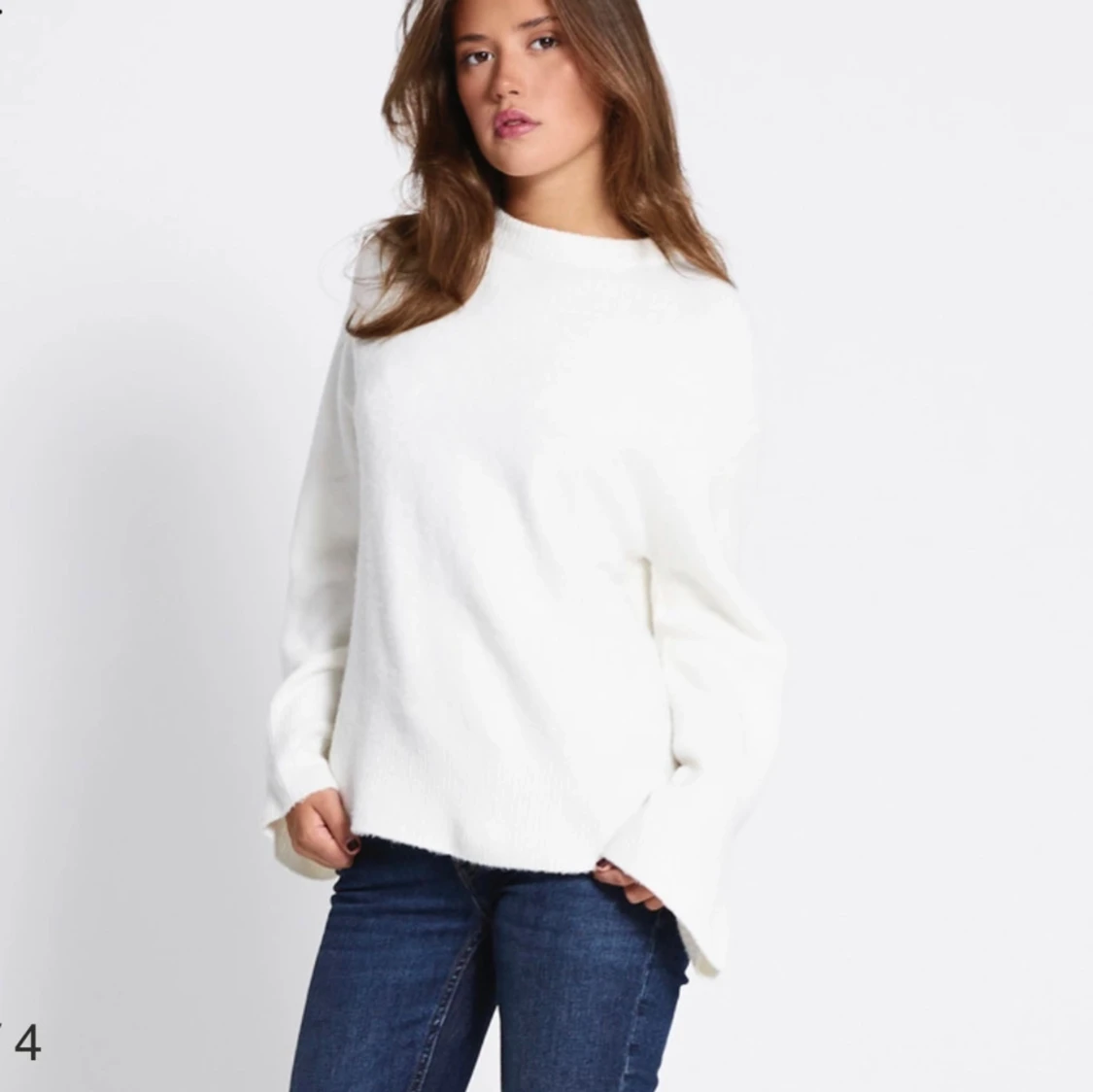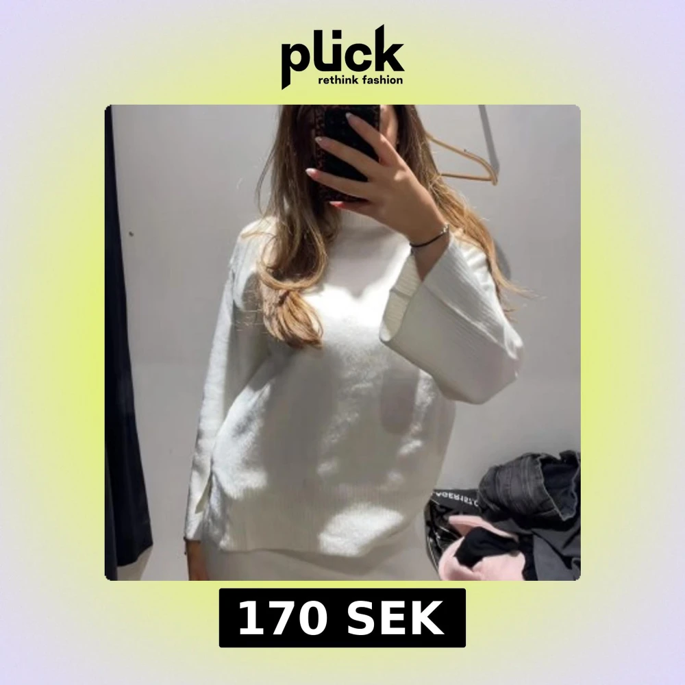Säljer en vit oversized stickad tröja med lång ärm och avslappnad passform. Tröjan har en enkel design med rund halsringning och mjukt material som känns skönt mot huden. Perfekt att slänga på sig när det är kyligt ute. Aldrig använd