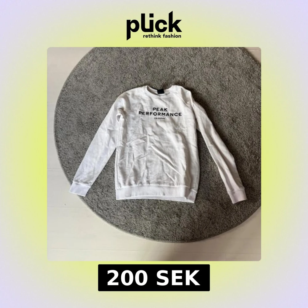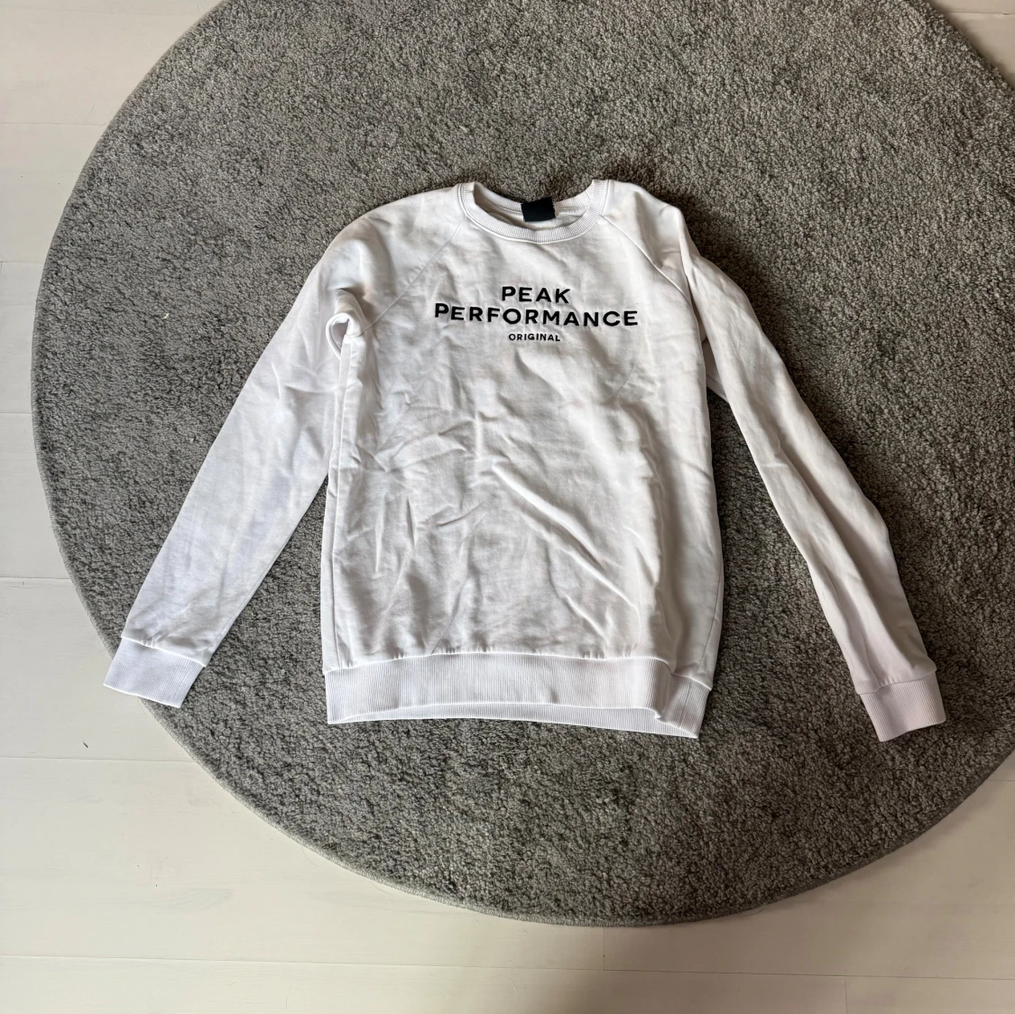 Snygg vit sweatshirt från Peak Performance med svart textprint på bröstet. Tröjan har rund hals, långa ärmar och ribbade muddar vid ärmslut och nederkant. Perfekt för dig som gillar stilren och sportig look. Storlek 170 men passar mig som har S.