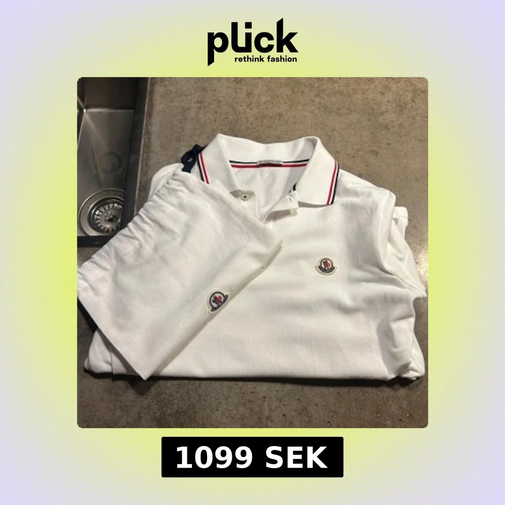 Säljer en stilren vit pikétröja från Moncler med klassisk krage och knappar. Tröjan har Monclers logga på bröstet och röd-blå randdetalj på kragen. Perfekt för en avslappnad men ändå elegant look.