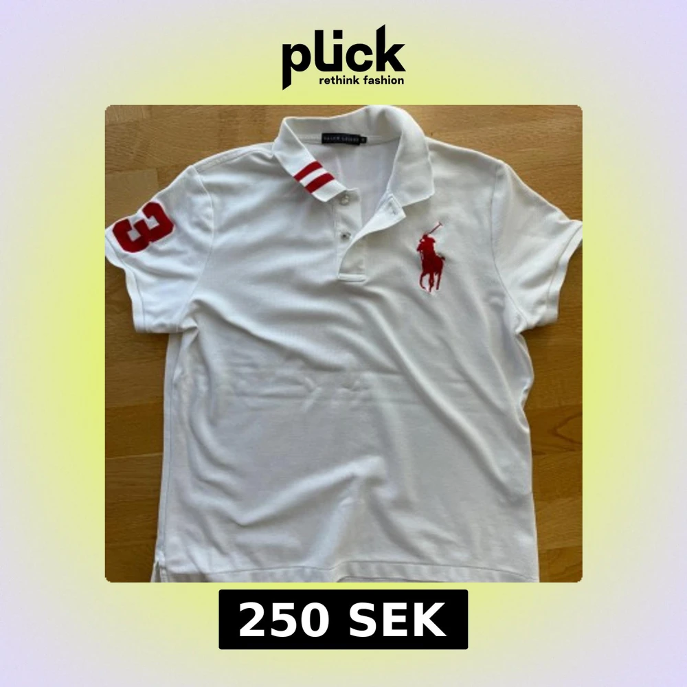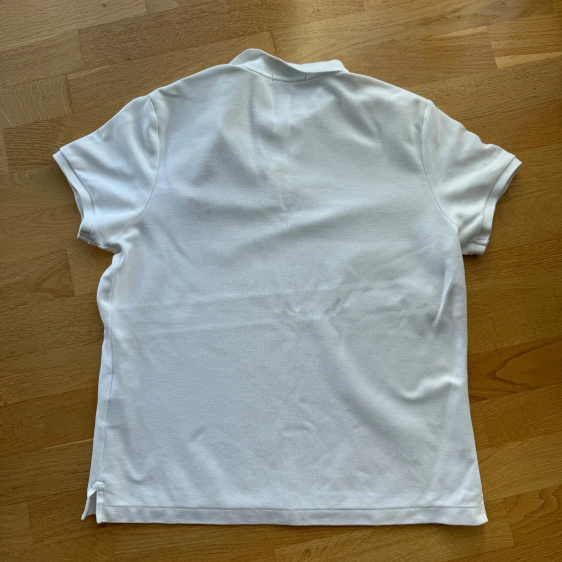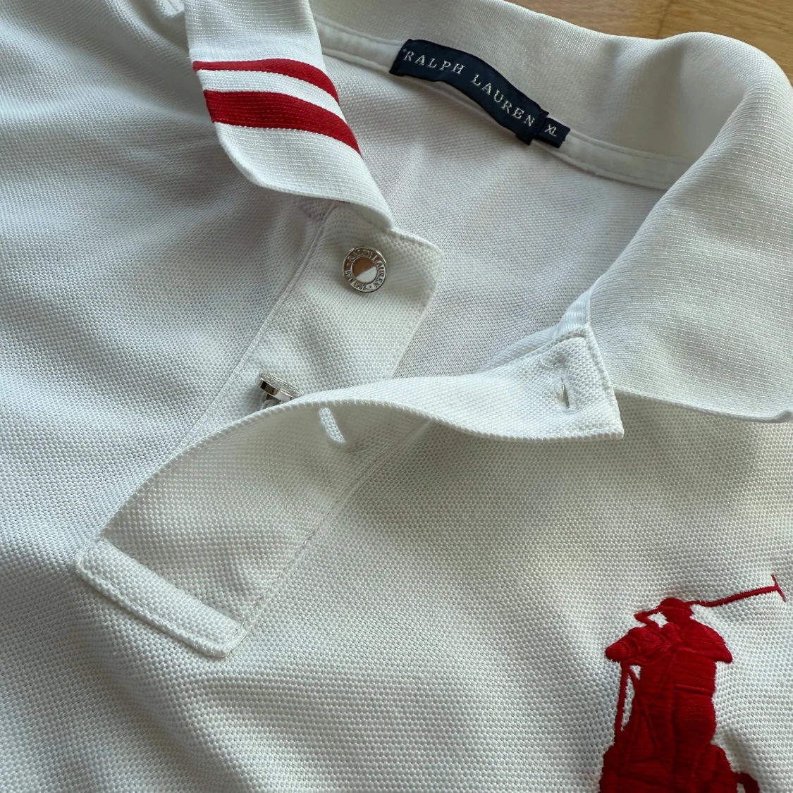 Vit pikétröja från Ralph Lauren med röd broderad logga på bröstet och röda ränder på kragen. Klassisk pikékrage, korta ärmar och knappslå framtill. Stor röd siffra 3 på ena ärmen. Tillverkad i bomull för en skön och luftig känsla. Tröjan är i syl XL men är liten i storleken. Jag är normalt en S/M men har som sagt haft den här i XL.