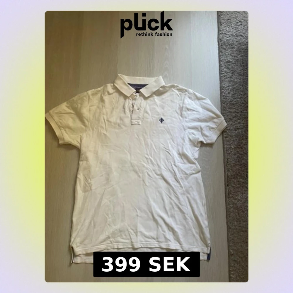 Vit pikétröja från Morris Stockholm i storlek M. Klassisk design med krage, korta ärmar och två knappar framtill. Broderad mörkblå logga på bröstet. Materialet är mjuk bomull och insidan av kragen har lila tyg med vita prickar för en extra detalj.