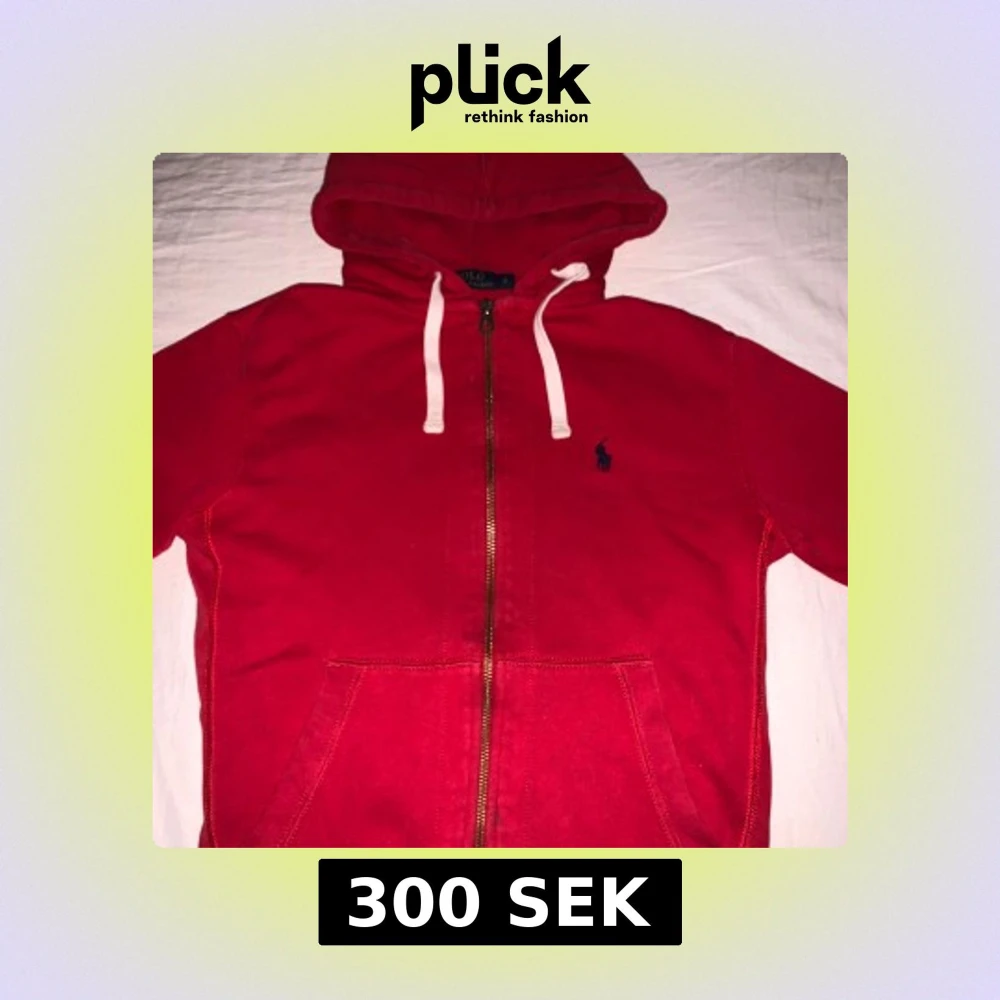 Röd hoodie från Polo Ralph Lauren med dragkedja och vit snörning i huvan. Klassisk broderad logga på bröstet och två fickor framtill. Perfekt för en avslappnad stil. Finns litet hål inne vid luvan men inget som syns vid användning.