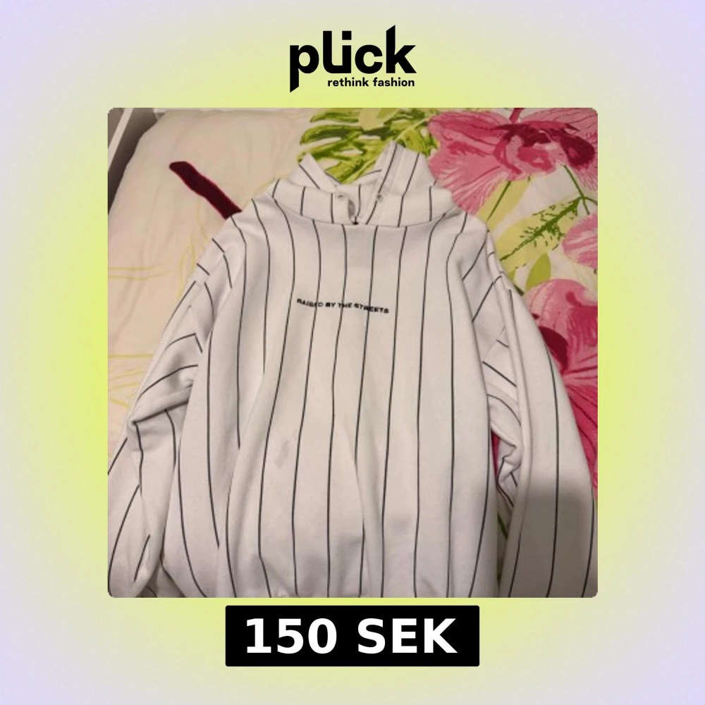 Vit hoodie med svarta tunna ränder och texten 'Raised by the Streets' på bröstet. Tröjan har huva och långa ärmar, samt ribbade muddar vid ärmslut och nederkant. Perfekt för en avslappnad stil. Baggy fit