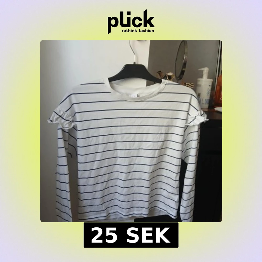 Vit långärmad tröja från Lindex med tunna mörkblå ränder och volangdetaljer vid axlarna. Tröjan har en rund hals och är gjord i mjuk bomull, perfekt för dig som gillar en chill och stilren look med lite extra detalj på ärmarna.