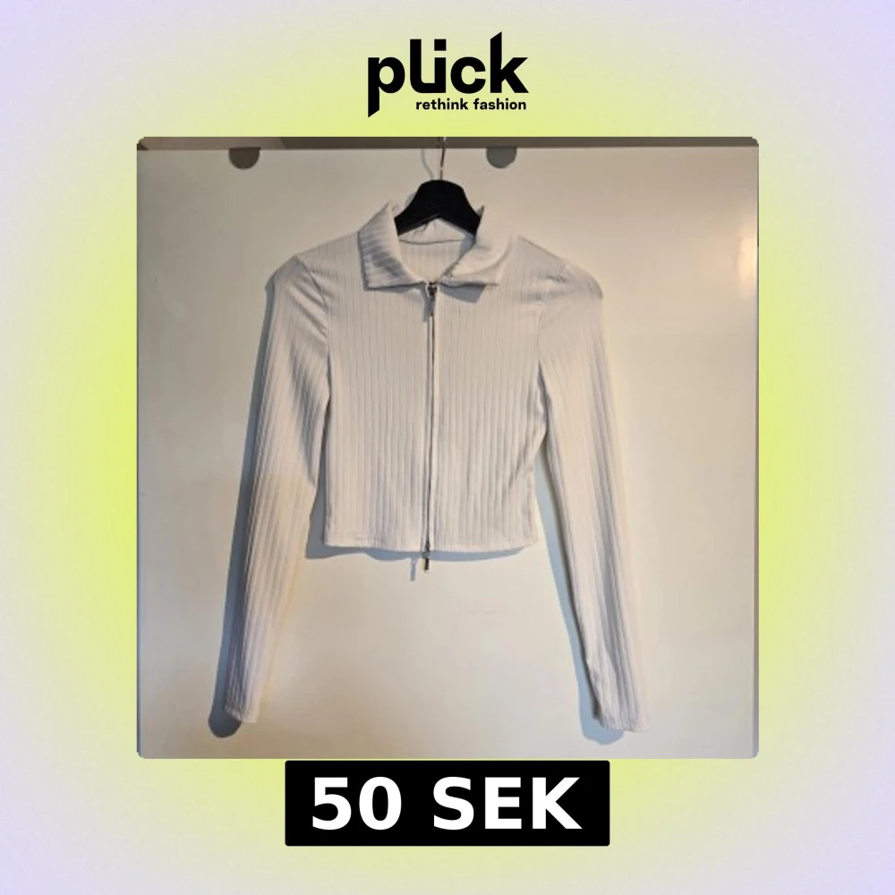 Säljer en vit croppad kofta med ribbad struktur och lång ärm. Tröjan har en klassisk krage och hel dragkedja framtill. Perfekt att styla med jeans eller kjol för en clean look.