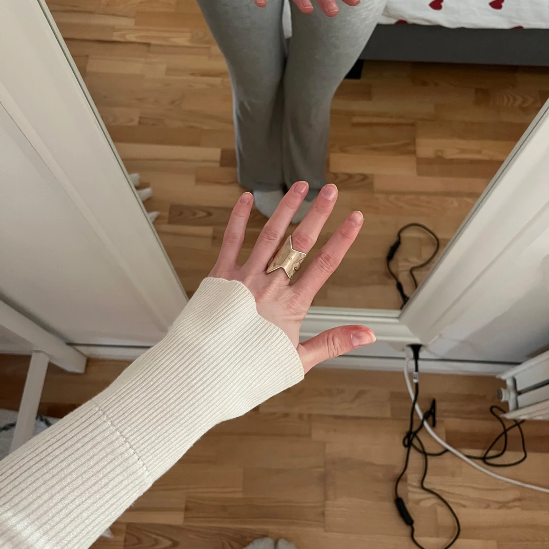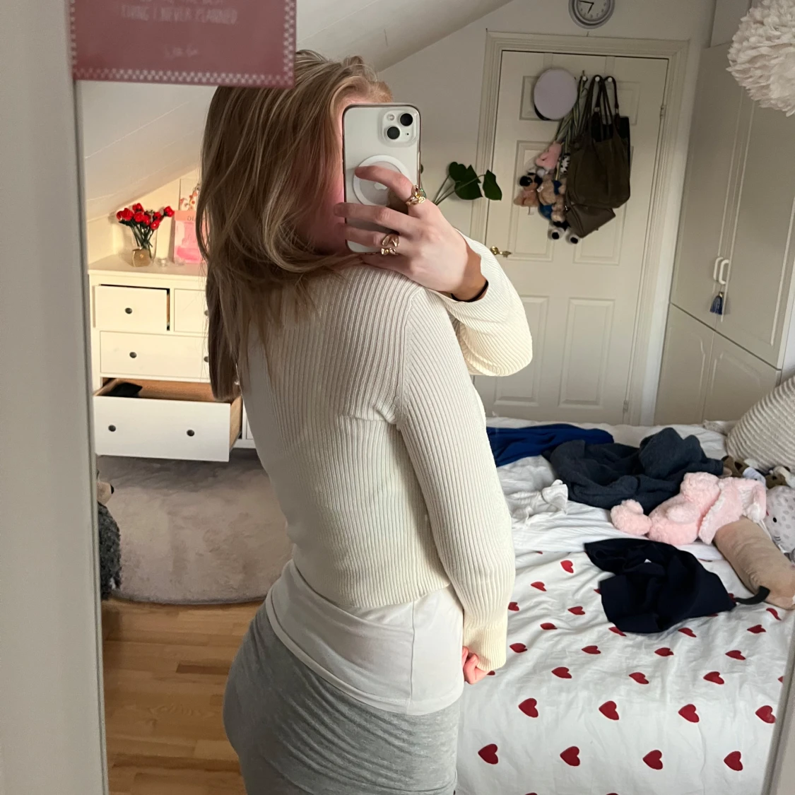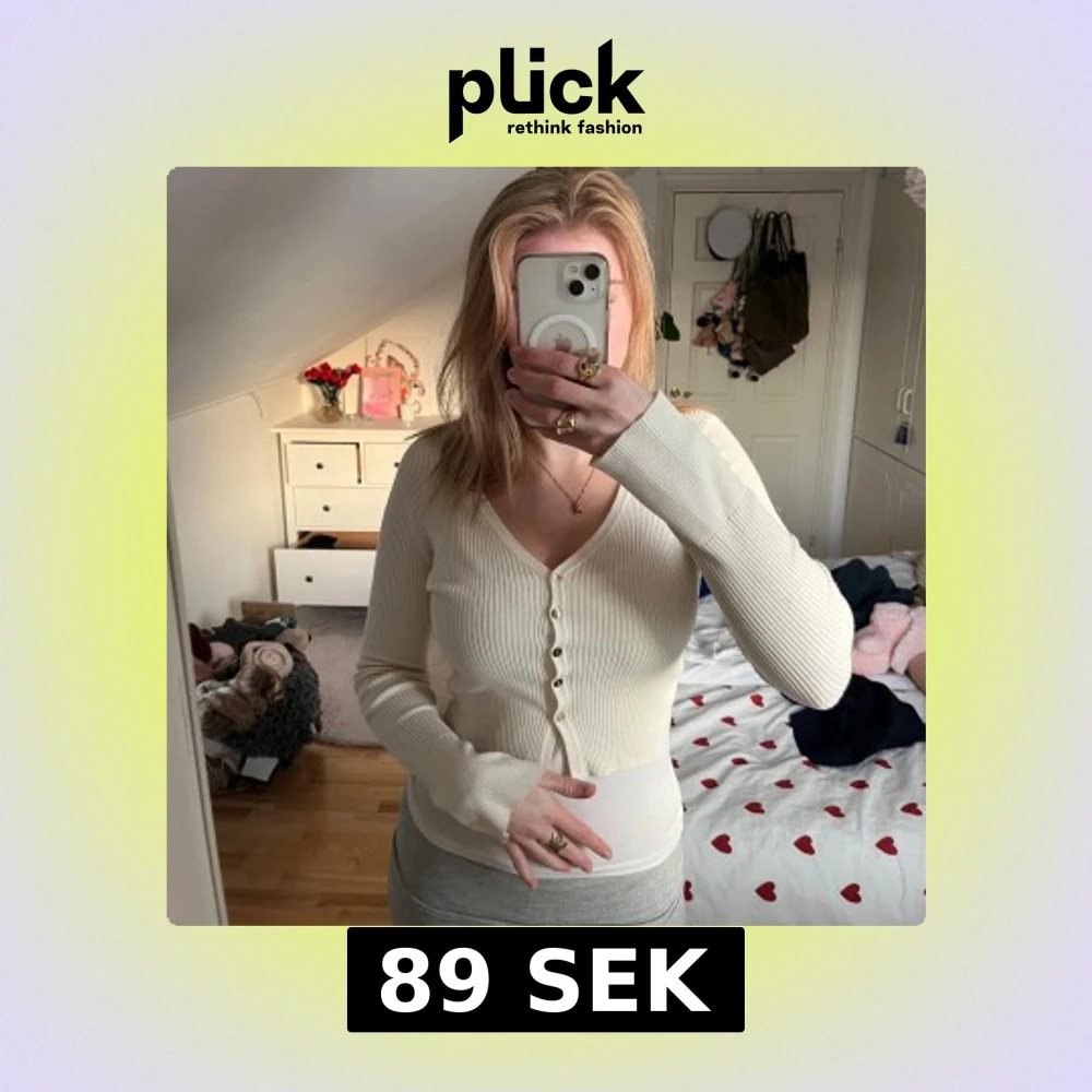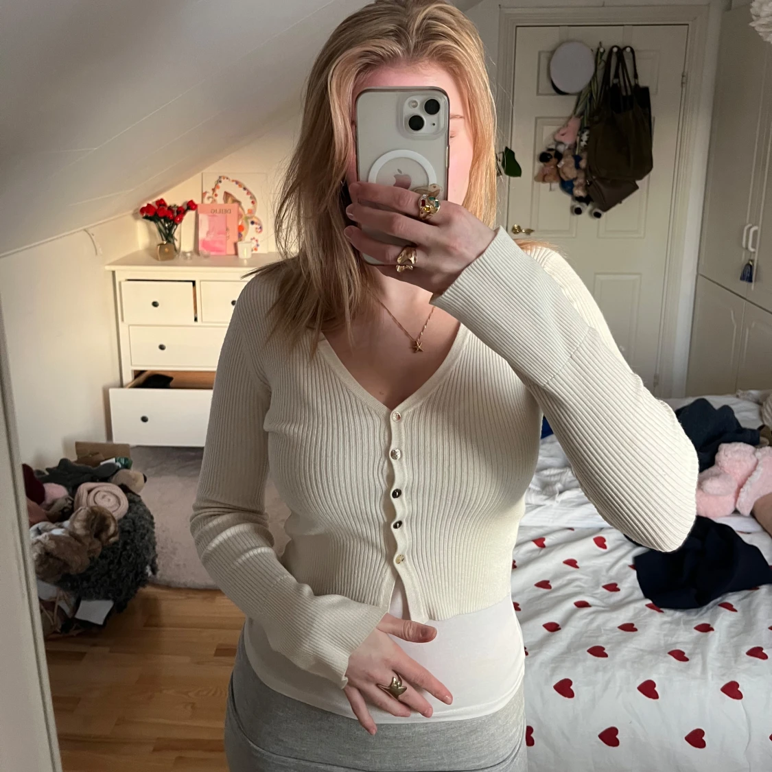 Säljer en stilren vit ribbad kofta med knappar framtill. Koftan har en v-ringad design och långa ärmar, perfekt för en avslappnad look. Passar bra till både jeans och kjol. Hör av dig vid intresse!