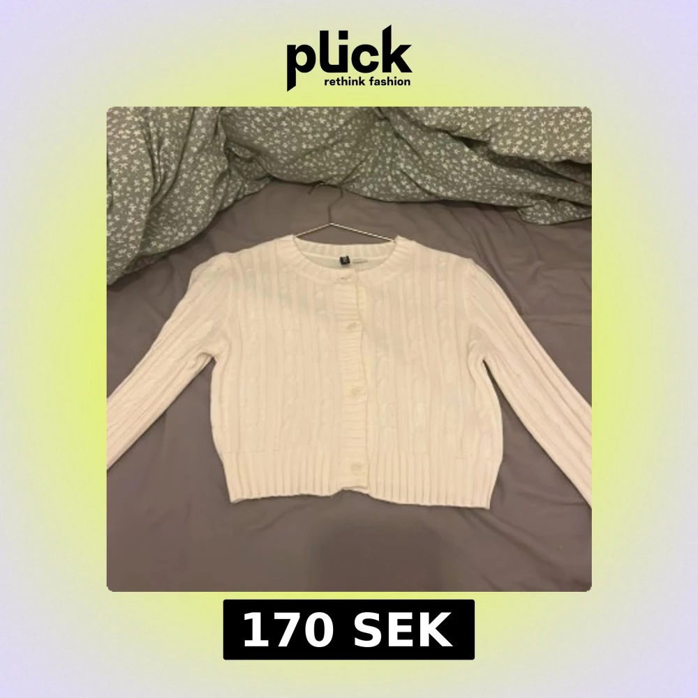 Säljer en söt vit kofta från H&M med ribbat mönster och rund halsringning. Koftan är croppad och har långa ärmar samt knappar framtill. Perfekt att slänga över en topp för en enkel och stilren look.