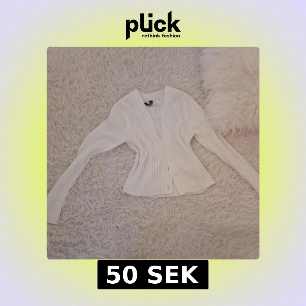 Säljer en vit ribbad kofta från H&M Divided i storlek S. Koftan har lång ärm, v-ringad hals och tre stora knappar framtill. Den är figurnära och gjord i mjukt stickat material, perfekt för lager-på-lager under hösten och vintern.